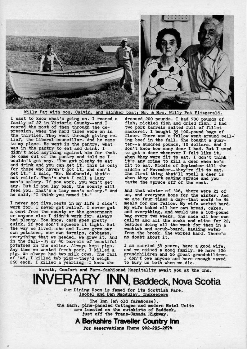 Published by Ronald Caplan on 1978/8/1 (267 reads)'' -??''/a Willy Pat with son. Calvin, and clinker boat; Mr. & Mrs. Willy Pat Fitzgerald. I want to know what's going on. I reared a family of 22 in Victoria County • and I reared the most of them through the de? pression, when the hard times were on in the thirties. They went through giving re? lief, the Liberal councillor. And he came to my place. He went in the pantry, what was in the pantry to eat and drink. I didn't hold anything against him for that. He came out of the pantry and told me I couldn't get any. You got plenty to eat and drink and you can get it. This is only for those who haven't got it, and can't get it." I said, "Mr. MacDonald, that's not relief. That's what I call a lazy man's salary. If you work, you won't get any. But if you lay back, the county will feed you. That's a lazy man's salary." And he said, "I think you named it." I never got five.cents in my life I didn't work for. I never got relief. I never got a cent from the county or the government or anyone else I didn't work for. Always had plenty. You know, cash goes pretty quick, if you don't squeeze it tight. But the way we lived • she and I • we grew our own potatoes, our own turnips, cabbages, everything that we needed, we grew it. And in the fall • 35 or 40 barrels of beautiful potatoes in the cellar. Always kept pigs. Any time we wanted fresh pork, I killed a pig. We always had two milk cows. The fall of '46, I killed two pigs--they'd weigh 250 each. I killed a yearling • I know she dressed 200 poimds. I had 700 poxmds of fish, pickled fish and dried fish. I had two pork barrels salted full of fillet mackerel. I bought 35 100-pound bags of floor. There was a fellow went aroiind sell? ing beef in the fall. She bought a quar? ter • a hundred pounds, 10 dollars. And I don't know how many deer I had. But I used to get a deer whenever I felt like it, when they were fit to eat. I don't think it's any crime to kill a deer when he's fit to eat. Middle of September till the middle of November • they're fit to eat. The first thing that'll spoil a deer is when they start eating spruce and you taste the spruce off of the meat. And that winter of '46, there were 21 of us, and everyone home for the winter. And we ate four times a day • that would be 84 meals for one fellow. My wife worked hard. My wife baked all her own bread, cakes, and everything, and would use a 100-pound bag every two weeks. She made all her own quilts arid all the socks arid mitts for 22, besides doing all the wash for them in a washtub and scrub-board, hauling water from the brook. She worked hard. There's no doubt about it. I am married 5' years, have a good wife, and we raised a good family. We have 106 grandchildren and 26 great-grandchildren. I don't owe anyone and have enough saved to bury us both when we die. Warmth, Comfort and Farm-fashioned Hospitality await you at the Inn* INVERARY INN. Baddeck, Nova Scotia Our Dining Room is famed for its Scottish Fare. Isobel and Dan MacAulay. Innkeepers The Inn (ah old farmhouse), the Bain, pine-paneled Cottages and modem Motel Units are located on the outskirts of Baddeck,. just off the Trans-Canada Hi'iway. A Berkshire Traveller Country im For Reservations Phone 90i-295-26?4