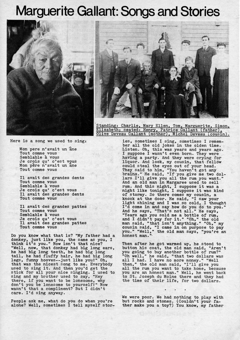 Published by Ronald Caplan on 1978/8/1 (416 reads)Marguerite Gallant: Songs and Stories Here is a song we used to sing: Mon pere n'avait un 'ane Tout comme vous Semblable a vous Je crois qu' c'est vous Mon pire n'avait un ane Tout comme vous II avait des grandes dents Tout comme vous Semblable a vous Je crois qu' c'est vous II avait des grandes dents Tout comme vous II avait des grandes pattes Tout comme vous Semblable a vous Je crois qu' c'est vous II avait des grandes pattes Tout comme vous Do you know what that is? "My father had a donkey, just like you, the same as you, I think it's you." Now isn't that nice? "Well, now, that donkey had big long ears, he had big long teeth, he had big long tail, he had fluffy hair, he had big long legs, funny hooves • just like you!" Oh, that was the nicest song to me. Everybody used to sing it. And then you'd get the stick for all your nice singing. I used to sing and my brother used to say, "Hey there, if you want to be lonesome, why don't you be lonesome to yourself!" Now wasn't that a compliment? But I didn't care. I'd sing anyway. People ask me, what do you do when you're alone? Well, sometimes I tell myself stor- Standing; Charlie, Mary Ellen, Tom. Marguerite, Simon, Elizabeth; seated; Henry, Patrice Gallant (father), Olive Deveau Gallant (mother), Michel Deveau (cousin). ies, sometimes I sing, sometiraes I remem? ber all the old jokes in the olden time. Listen. Oh, this was years and years ago. I suppose I wasn't even born. They were having a party. And they were crying for liquor. And look, my cousin, that fellow could steal the eyes out of your head. They said to him, "You haven't got any brains." He said, "If you give me two dol? lars I'll give you all the rum you want." And an old man in Margaree used to sell rum. And this night, I suppose it was a night like tonight, I suppose it was kind of stormy. So there comes my cousin, a knock at the door. He said, "I saw your light shining and I was so cold, I thought I'd come in and say how do you do to you." And he says, "That's not all." He says, "Years ago you sold me a bottle of rum, and I didn't pay for it." "Oh," the old man said, "that isn't anything." "Oh," my cousin said, "I came in on purpose to pay you." "Well," the old man says, "you're an honest man."- Then after he got warmed up, he stood to button his coat, the old man said, "Aren't you going to buy another bottle of rum?" "Oh well," he said, "that two dollars was all I had. I have no more money." "Well then," the old man said, "I'll give you all the rum you want to take home, because you are an honest man." Well, he went back to St. Joseph du Moine there and they had the time of their life, for two dollars. We were poor. We had nothing to play with but rocks and stones. (Couldn't your fa? ther make you a toy?) You know, my father