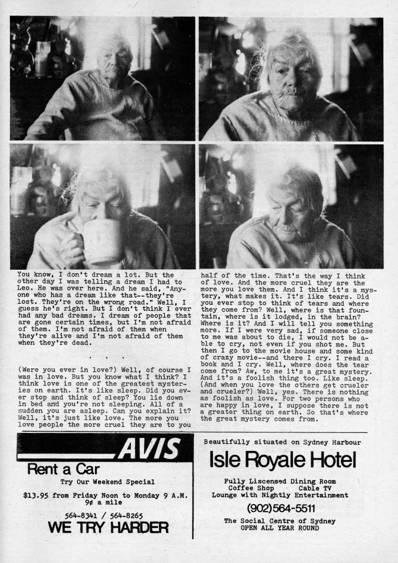 Published by Ronald Caplan on 1978/8/1 (233 reads)You know, I don't dream a lot. But the other day I was telling a dream I had to Leo. He was over here. And he said, "Any? one who has a dream like that • they're lost. They're on the wrong road." Well, I guess he's right. But I don't think I ever had any bad dreams. I dream of people that are gone certain times, but I'm not afraid of them. I'm not afraid of them when they're alive and I'm not afraid of them when they're dead. (Were you ever in love?) Well, of course I was in love. But you know what I think? I think love is one of the greatest myster? ies on earth. It's like sleep. Did you ev? er stop and think of sleep? You lie down in bed and you're not sleeping. All of a sudden you are asleep. Can you explain it? Well, it's just like love. The more you love people the more cruel they are to you half of the time. That's the way I think of love. And the more cruel they are the more you love them. And I think it's a mys? tery, what makes it. It's like tears. Did you ever stop to think of tears and where they come from? Well, where is that foun? tain, where is it lodged, in the brain? Where is it? And I will tell you something more. If I were very sad, if someone close to me was about to die, I would not be a- ble to cry, not even if you shot me. But then I go to the movie house and some kind of crazy movie • and there I cry. I read a book and I cry. Well, where does the tear come from? Aw, to me it's a great mystery. And it's a foolish thing too. Like sleep. (And when you love the others get crueler and crueler?) Well, yes. There is nothing as foolish as love. For two persons who are happy in love, I suppose there is not a greater thing on earth. So that's where the great mystery comes from. AVIS Rent a Gar Try Our Weekend Special $13.95 from Friday Noon to Monday 9 A.M. 90 a mile 564-8341 / 564-8265 WE TRY HARDER Beautifully situated on Sydney Harbour Isle Ftayale Hotel Fully Liscensed Dining Room Coffee Shop Cable TV Lounge with Nightly Entertainment (902)564-5511 The Social Centre of Sydney OPEN ALL YEAR ROUND
