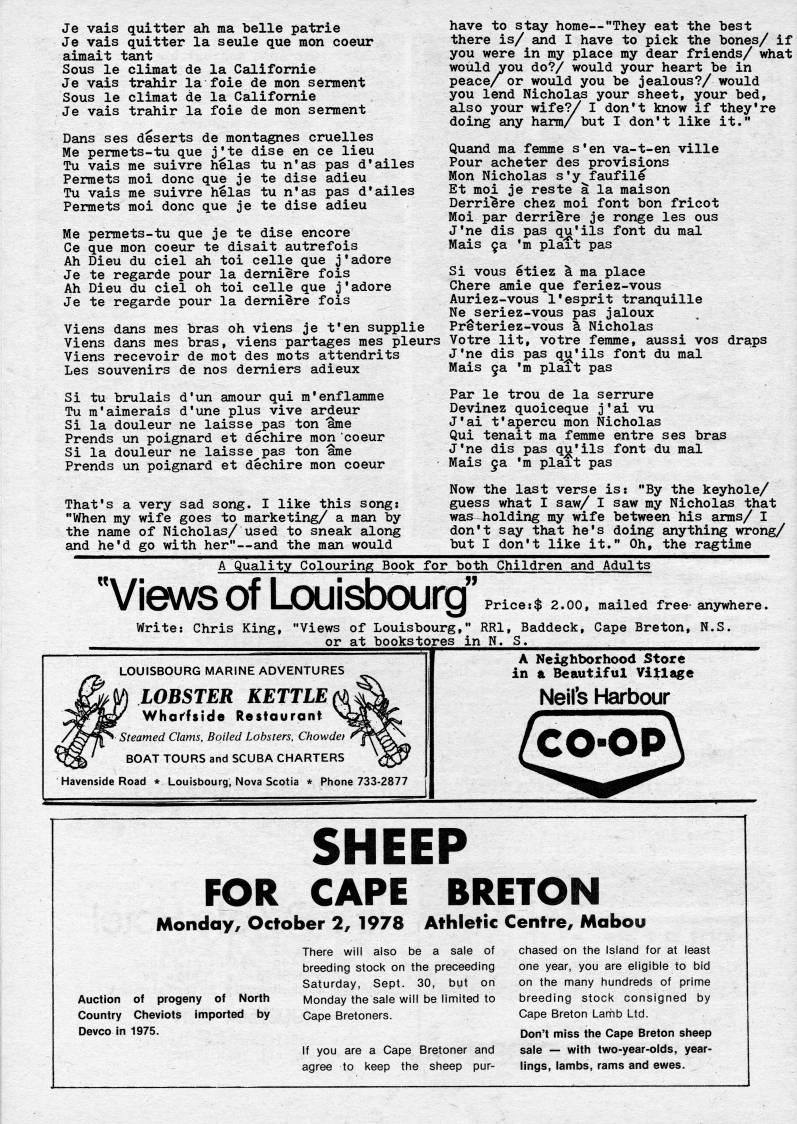 Published by Ronald Caplan on 1978/8/1 (234 reads)Je vais quitter ah ma belle patrie Je vais quitter la seule que mon coeur aimait tant Sous le climat de la Califomie Je vais trahir la foie de mon serment Sous le climat de la Califomie Je vais trahir la foie de mon serment Dans ses deserts de montagnes cruelles Me permets-tu que j'te dise en ce lieu Tu vais me suivre helas tu n'as pas d'ailes Permets moi done que je te dise adieu Tu vais me suivre helas tu n'as pas d'ailes Permets moi done que je te dise adieu Me permets-tu que je te dise encore Ce que mon coeur te disait autrefois Ah Dieu du ciel ah toi celle que j'adore Je te regarde pour la demiire fois Ah Dieu du ciel oh toi celle que j'adore Je te regarde pour la demi're fois Viens dans mes bras oh viens je t'en supplie Viens dans mes bras, viens partages mes pleurs Viens recevoir de mot des mots attendrits Les souvenirs de nos demiers adieux Si tu brulais d'un amour qui m'enflamme Tu m'aimerais d'une plus vive ardeur Si la douleur ne laisse'pas ton ame Prends un poignard et dechire mon coeur Si la douleur ne laisse'pas ton ame Prends un poignard et dechire mon coeur That's a very sad song. I like this song: "When my wife goes to marketing/ a man by the name of Nicholas/ used to sneak along and he'd go with her" • and the man would have to stay home • "They eat the best there is/ and I have to pick the bones/ if you were in my place my dear friends/ what would you do?/ would your heart be in peace/ or would you be jealous?/ would you lend Nicholas your sheet, your bed, also your wife?/ I don't know if they're doing any harm/ but I don't like it." Quand ma femme s'en va-t-en ville Pour acheter des provisions Mon Nicholas s'y faufile Et moi je reste a la maison Derri"'re chez moi font bon fricot Moi par derriere je ronge les ous J'ne dis pas qu'ils font du mal Mais 'a 'm plait pas Si vous etiez a ma place Chere amie que feriez-vous Auriez-vous 1*esprit tranquille Ne seriez-vous pas jaloux PrSteriez-vous Nicholas Votre lit, votre femme, aussi vos draps J'ne dis pas qu'ils font du mal Mais ga 'm plait pas Par le trou de la serrure Devinez quoiceque j'ai vu J'ai t'apercu mon Nicholas Qui tenait ma femme entre ses bras J'ne dis pas qj''ils font du mal Mais 5a 'm plait pas Now the last verse is: "By the keyhole/ guess what I saw/ I saw my Nicholas that was holding my wife between his arms/ I don't say that he's doing anything wrong/ but I don't like it." Oh, the ragtime A Quality Colouring Book for both Children and Adults Price:$ 2.00, mailed free- anywhere. "Views of LxHjisbourg' Write: Chris King, "Views of Louisbourg," RRl, Baddeck, Cape Breton, N.S. or at bookstores in N. S. LOUISBOURG MARINE ADVENTURES LOBSTER KETTLE Whaffslde Restaurant Steamed Clams, Boiled Lobsters, Chowdet BOAT TOURS and SCUBA CHARTERS Havenside Road * Louisbourg, Nova Scotia * Phone 733-2877 A Neighborhood Store in a Beautiful Village Neil's Harbour CO-OP SHEEP FOR CAPE BRETON Monday, October 2, 1978 Athletic Centre, Mabou Auction of progeny of North Country Cheviots imported by Devco in 1975. There will also be a sale of breeding stock on the proceeding Saturday, Sept. 30, but on Monday the sale will be limited to Cape Bretoners. If you are a Gape Bretoner and agree to keep the sheep pur? chased on the Island for at least one year, you are eligible to bid on the many hundreds of prime breeding stock consigned by Cape Breton Lartib Ltd. Don't miss the Cape Breton sheep sale • with two-year-olds, year? lings, lambs, rams and ewes.