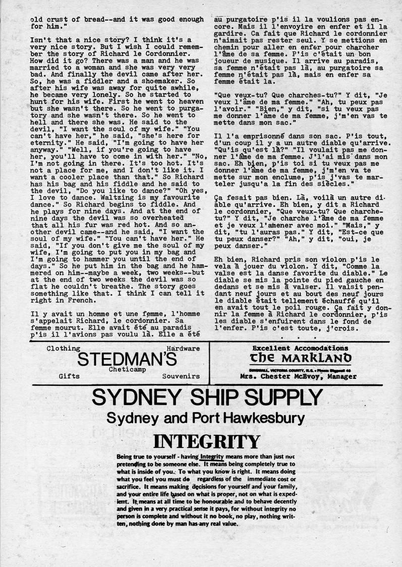 Published by Ronald Caplan on 1978/8/1 (207 reads)old crust of bread • and it was good enough for him." Isn't that a nice story? I think it's a very nice story. But I wish I could remem? ber the story of Richard le Cordonnier. How did it go? There was a man and he was married to a woman and she was very very bad. And finally the devil came after her. So, he was a fiddler and a shoemaker. So after his wife was away for quite awhile, he became very lonely. So he started to hunt for his wife. First he went to heaven but she wasn't there. So he went to purga? tory and she wasn't there. So he went to hell and there she was. He said to the devil, "I want the soul of my wife." "You can't have her," he said, "she's here for eternity." He said, "I'm going to have her anyway." "Well, if you're going to have her, you'll have to come in with her." "No, I'm not going in there. It's too hot. It's not a place for me, and I don't like it. I want a cooler place than that." So Richard has his bag and his fiddle and he said to the devil, "Do you like to dance?" "Oh yes, I love to dance. Waltzing is my favourite dance." So Richard begins to fiddle. And he plays for nine days. And at the end of nine days the devil was so overheated that all his fur was red hot. And so an? other devil came • 'and he said, "I want the soul of my wife." "You can't have her." He said, "If you don't give me the soul of my wife, I'm going to put you in my bag and I'm going to hammer you until the end of days." So he put him in the bag and he ham? mered on him • maybe a week, two weeks • but at the end of two weeks the devil was so flat he couldn't breathe. The story goes something like that, I think I can tell it right in French. II y avait un homme et une fpmme, l'homme s'appelait Richard, le cordonnier. Sa femme mourut. Eile avait • te au paradis p'is il 1'avions pas voulu la. Eile a ete au purgatoire p'is il la voulions pas en? core. Mais il I'envoyire en enfer et il la gardire. Ca fait que Richard le cordonnier n'aimait pas rester seul. Y se mettions en chemin pour aller en enfer'pour charcher I'ltoe de sa femme. P'is c'etait un bon joueur de musique. II arrive au paradis, sa femme'n'etait pas la, au purgatoire sa femme n'etait pas 111, mais en enfer sa femme etait la. "Que veux-tu? Que charches-tu?" Y dit, "Je veux I'ame de ma femme." "Ah, tu peux pas 1'avoir." "BJen," y dit, "si tu veux pas me donner I'ame de ma femme, j'm'en vas te mette dans mon sac." II I'a emprisonne dans son sac. P'is tout, d'un coup il y a un autre diable qu'arrive. "Qu'is qu'est lit?" "II voulait pas me don? ner 1' altoe de ma femme. J' 1' ai mis' dans mon sac. Eh bien, p'is toi si tu veux pas me donner I'ame de ma femme, j'm'en va te mette sur mon enclume, p'is j'vas te mar- teler jusqu'a la fin des siBcles." ??a fesait pas bien. La, voilii un autre di- able qu'arrive. Eh bien, y dit a Richard le cordonnier, "Que veux-tu? Que charche- tu?" Y dit, "Je charche l'3me de ma femme et je veux I'amener avec moi." "Mais," y dit, "tu 1'auras pas." Y dit, "Est-ce que tu peux danser?" "Ah," y dit, "oui, je peux danser." Eh bien, Richard pris son violon p'is le vela a jouer du violon. Y dit, "Comme la valse est la danse favorite du diable." Le diable se mis la pointe du pied gauche en dedans et se mis a valser. II valsit pen? dant neuf jours et au bout des neuf jours le diable 'tait tenement 'chauffe qu'il en avait tout le poll rouge. Ca fait y don- nir la femme a Richard le cordonnier, p'is les diable s'enfuirent dans le fond de 1'enfer. P'is c'est toute, j'crois. Clothing STEDMAN'S Hardware Gifts Cheticamp Souvenirs Excellent Accomodations aMOHMU. vicnMiM oouNrr, !!.& .mmmi MiPMa 4? Mrs. Chester McBvoy, Manager SYDNEY SHIP SUPPLY Sydney and Port Hawkesbury INTEGRITY Being true to yourself - havinj' Integrity means more than just noc preten'ng to be someone else. It means being completely true to what is inside of you.; To what you kiiow is right. It means doing what you feel you must do regardless of the immediate cost or sacrifice. It means making decisions for yourself ancf your family, and your entire life l''ised on what is proper, not on what is exped? ient. It'means at all time to be honourable and to behave decently and given in a very practical sense it pays' for without integrity no parson is complete and without it no book, no play, nothing writ? ten, nothing done by man has any real value.