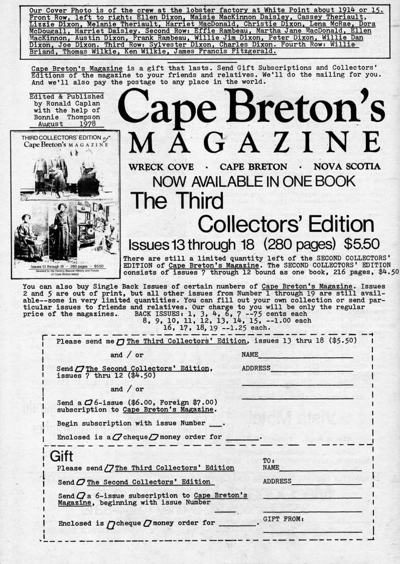 Our Cover Photo is of the crew at the lobster factory at White Point about 1914 or 15. Front Row, left; to right: Ellen Dixon' Maisie MacKinnon Daisley. Cassey Theriault, Lizzie Dixon, "Melanie Theriault, Harriet MacDonald. Christie Dixon. Lena McRae, Dora McDougall, Harriet Daisley. Second Row; Effie Rambeau. Martha Jane MacDonald. Ellen MacKinnon, Austin Dixon, Frank Rambeau. Willie Jim Dixon. Peter Dixon, Willie Dan Dixon. Joe Dixon. Third Row: Sylvester Dixon, Charles Dixon. Fourth Row; Willie Briand, Thomas Wilkie, Ken Wilkie, James Francis Fitzgerald. Cape Breton's Magazine is a gift that lasts. Send Gift Subscriptions and Collectors' Editions of the magazine to your friends and relatives. We'll do the mailing for you. And we'll also pay the postage to any place in the world. Edited & Published by Ronald Caplan with the help of Bonnie Thompson August 1978 THIRD COLLECTORS' EDITION oj- Cape Breton's magazine Cape Breton's M AG A ZIN E WRECK COVE . CAPE BRETON • NOVA SCOTIA NOW AVAILABLE IN ONE BOOK The Third Collectors' Edition Issues 13 through 18 (280 pages) $5.50 There are still a limited quantity left of the SECOND COLLECTORS' EDITION of Cape Breton's Magazine. The SECOND COLLECTORS' EDITION consists of issues 7 through 12 bound as one book, 216 pages, $4.50 You can also buy Single Back Issues of certain numbers of Cape Breton's Magazine. Issues 2 and 5 are out of print, but all other issues from Number 1 through 19 are still avail? able • some in very limited quantities. You can fill out your own collection or send par? ticular issues to friends and relatives. Our charge to you will be only the regular price of the magazines.. BACK ISSUES: 1, 3, 4, 6, 7 • 75 cents each 8, 9, 10, 11, 12, 13, 14, 15, • 1.00 each 16, 17, 18, 19 • 1.25 each. ' Please send me' The Third Collector'' Edition, issues 13 thni 18 ($5.50) and / or Send OThe Second CQllepliQrs' Eai1;iQp, issues 7 thru 12 ($4.50) and / or Send a C76-issue ($6.00, Foreign $7.00) subscription to Cape Breton's Magazine. Begin subscription with issue Number . Enclosed is a(C7cheque'money order for NAME ADDRESS Gift Please send'7''' Third Collectors' Edition Send'The Second Collectors* Edition Send • a 6-issue subscription to Cape Breton's Magazine. beginning with issue Number TO: NAME ADDRESS Enclosed s rjfu'ieqyx' Qmm%y order for GIFT FROM;