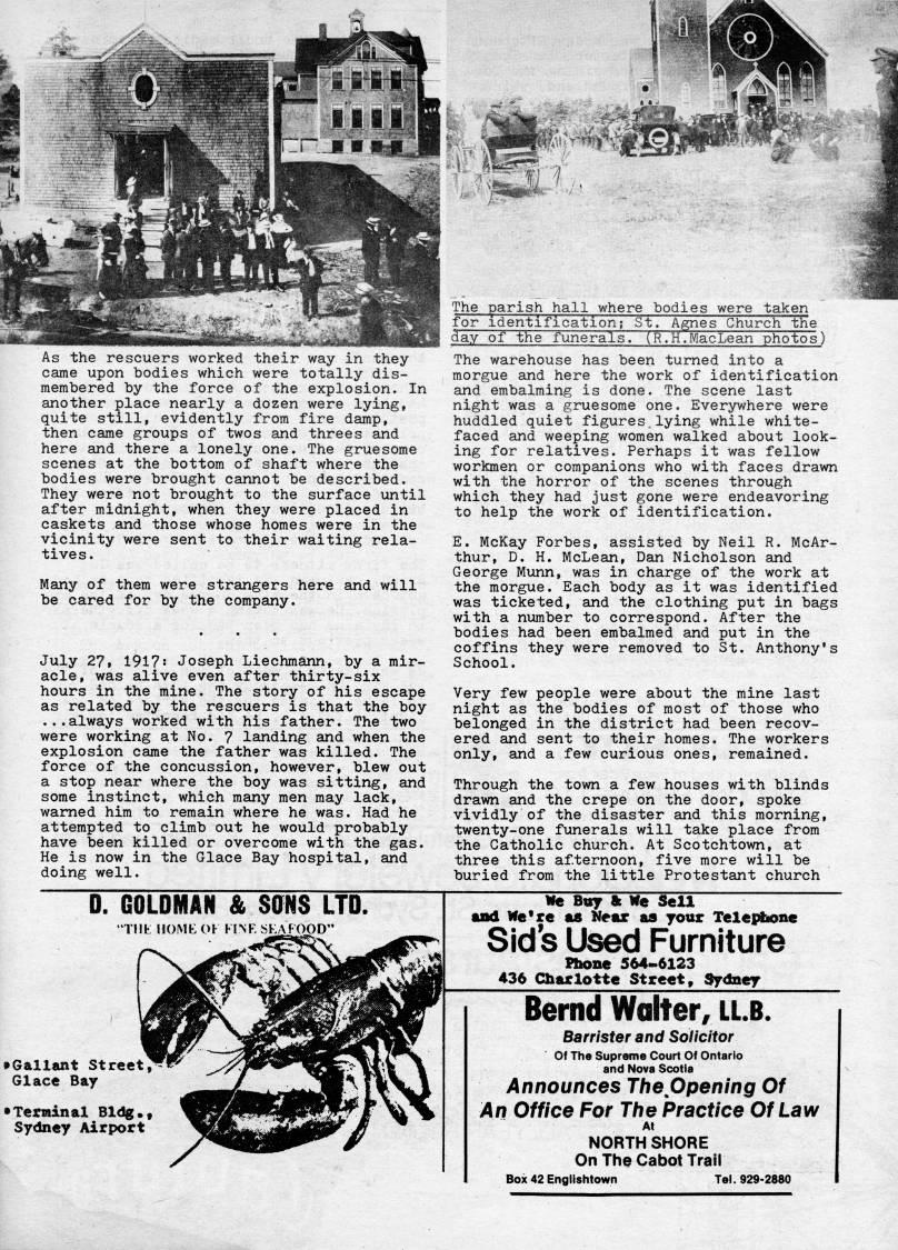 Published by Ronald Caplan on 1978/12/1 (720 reads)As the rescuers worked their way in they came upon bodies which were totally dis? membered by the force of the explosion. In another place nearly a dozen were lying, quite still, evidently from fire damp, then came groups of twos and threes and here and there a lonely one. The gruesome scenes at the bottom of shaft where the bodies were brought cannot be described. They were not brought to the surface until after midnight, when they were placed in caskets and those whose homes were in the vicinity were sent to their waiting rela? tives. Many of them were strangers here and will be cared for by the company. July 27?? 1917s Joseph Liechmann, by a mir? acle, was alive even after thirty-six hours in the mine. The story of his escape as related by the rescuers is that the boy ...always worked with his father. The two were working at No. 7 landing and when the explosion came the father was killed. The force of the concussion, however, blew out a stop near where the boy was sitting, and some instinct, which many men may lack, warned him to remain where he was. Had he attempted to climb out he would probably have been killed or overcome with the gas. He is now in the Glace Bay hospital, and doing well. The parish hall where bodies were taken for Identification; St. Agnes Church the day of the funerals. (R.H.MacLean photos) The warehouse has been turned into a morgue and here the work of identification and embalming is done. The scene last night was a gruesome one. Everywhere were huddled quiet figures.lying while white- faced and weeping women walked about look? ing for relatives. Perhaps it was fellow workmen or companions who with faces drawn with the horror of the scenes through which they had just gone were endeavoring to help the work of identification. E. McKay Forbes, assisted by Neil R. McAr- thur, D. H. McLean, Dan Nicholson and George Munn, was in charge of the work at the morgue. Each body as it was identified was ticketed, and the clothing put in bags with a number to correspond. After the bodies had been embalmed and put in the coffins they were removed to St. Anthony's School. Very few people were about the mine last night as the bodies of most of those who belonged in the district had been recov? ered and sent to their homes. The workers only, and a few curious ones, remained. Through the town a few houses with blinds drawn and the crepe on the door, spoke vividly of the disaster and this morning, twenty-one funerals will take place from the Catholic church. At Scotchtown, at three this af.ternoon, five more will be buried from the little Protestant church We Buy & We Sell and We*re as Near as your Telephone Sids Used Furniture Rione 564-6123 436 Charlotte Street, Sydney Bernd Walter, llb. Barrister and Solicitor Of The Supreme Court Of Ontario and Nova Scotia Announces TtieOpening Of An Office For Ttie Practice Of Law At NORTH SHORE On The Cabot Trail Box 42 Englishtown Tei. 929-2880 D. GOLDMAN & SONS LTD "Tilt; nOMK OF KJNK SKAFOOD" ??Gallant Street, Glace Bay • Terminal Bldg.? Sydney Airport