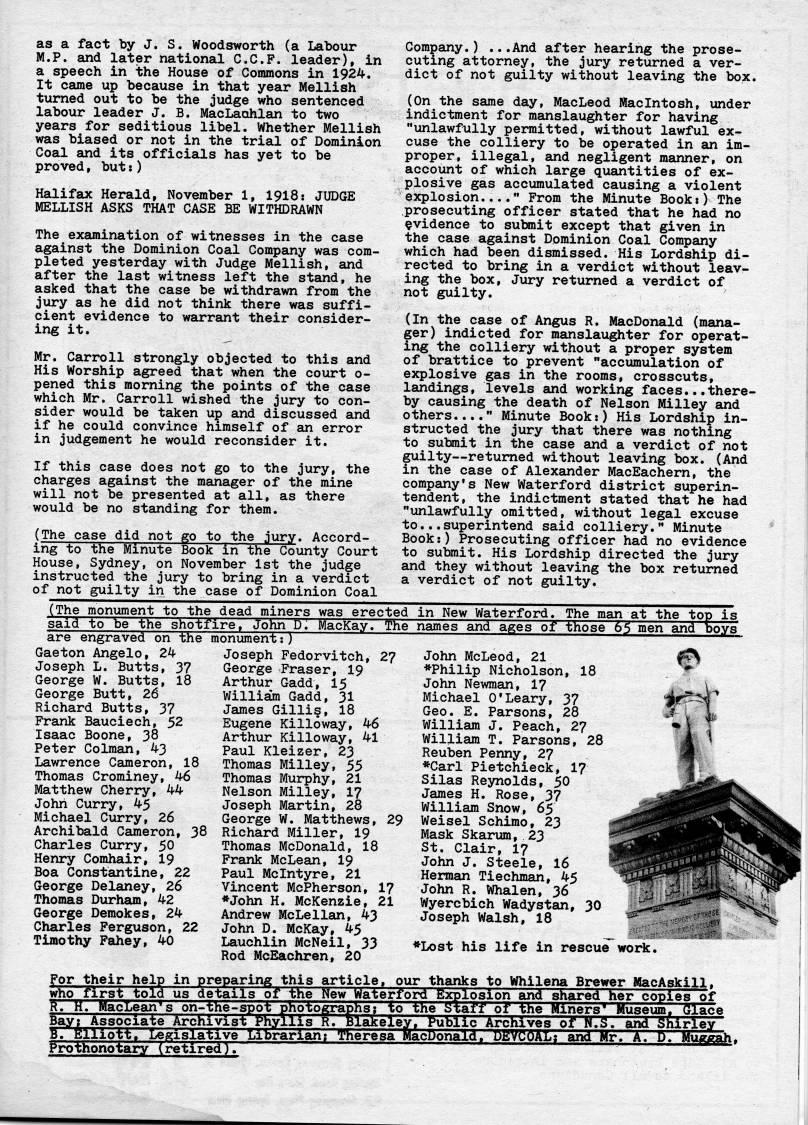 as a fact by J. S. Woodsworth (a Labour M.P. and later national C.C.F. leader), in a speech in the House of Commons in 1924. It came up because in that year Mellish turned out to be the judge who sentenced labour leader J. B. MacLaohlan to two years for seditious libel. Whether Mellish was biased or not in the trial of Dominion Coal and its officials has yet to be proved, but:) Halifax Herald, November 1, I9I8: JUDGE MELLISH ASKS THAT CASE BE WITHDRAWN The examination of witnesses in the case against the Dominion Coal Company was com? pleted yesterday with Judge Mellish, and after the last witness left the stand, he asked that the case be withdrawn from the jury as he did not think there was suffi? cient evidence to warrsint their consider? ing it. Mr. Carroll strongly objected to this and His Worship agreed that when the court 0- pened this morning the points of the case which Mr. Carroll wished the jury to con? sider would be taken up and discussed and if he could convince himself of an error in judgement he would reconsider it. If this case does not go to the jury, the charges against the manager of the mine will not be presented at all, as there would be no standing for them. (The case did not go to the jury. Accord? ing to the Minute Book m the County Court House, Sydney, on November 1st the judge instructed the jury to bring in a verdict of not guilty in the case of Dominion Coal Company.) ...And after hearing the prose? cuting attorney, the jury returned a ver? dict of not guilty without leaving the box. (On the same day, MacLeod Macintosh, under indictment for manslaughter for having "unlawfully permitted, without lawful ex? cuse the colliery to be operated in an im? proper, illegal, and negligent manner, on account of which large quantities of ex? plosive gas acciamulated causing a violent explosion...." From the Minute Book:) The prosecuting officer stated that he had no evidence to submit except that given in the case against Dominion Coal Company which had been dismissed. His Lordship di? rected to bring in a verdict without leav? ing the box. Jury returned a verdict of not guilty. (In the case of Angus R. MacDonald (mana? ger) indicted for manslaughter for operat? ing the colliery without a proper system of brattice to prevent "accumulation of explosive gas in the rooms, crosscuts, landings, levels and working faces...there? by causing the death of Nelson Milley and others...." Minute Book:) His Lordship in? structed the jury that there was nothing to submit in the case and a verdict of not guilty • returned without leaving box. (And in the case of Alexander MacEachern, the company's New Waterford district superin? tendent, the indictment stated that he had "unlawfully omitted, without legal excuse to... superintend said colliery." Minute Book:) Prosecuting officer had no evidence to submit. His Lordship directed the jury and they without leaving the box returned a verdict of not guilty. (The monument to the dead miners was erected said to be the shotfire, John D. MacKay. The in New Waterford. The man at the to" are engraved on the monument:) Gaeton Angelo, 24 Joseph L. Butts, 37 George W. Butts, 18 George Butt, 26 Richard Butts, 37 Frank Bauciech, 52 Isaac Boone, 38 Peter Colman, 43 Lawrence Cameron, 18 Thomas Crominey, 46 Matthew Cherry, 44 John Curry, 45 Michael Curry, Z(> Archibald Csimeron, 38 Charles Curry, 50 Henry Comhair, 19 Boa Constantine, 22 George Delaney, 26 Thomas Durham, 42 George Demokes, 24 Charles Ferguson, 22 Timothy Fahey, 40 Joseph Fedorvitch, Z' George Fraser, 19 Arthur Gadd, I5 William Gadd, 31 James Gillis, 18 Eugene Killoway, 46 Arthur Killoway, 41 Paul Kleizer, 23 Thomas Milley, 55 Thomas Murphy, 21 Nelson Milley, 1? Joseph Martin, 28 George W. Matthews, Richard Miller, 19 Thomas McDonald, 18 Frank McLean, I9 Paul Mclntyre, 21 Vincent McPherson, 17 John H. McKenzie, 21 Andrew McLeiIan, 43 John D. McKay, 45 Lauchlin McNeil, 33 Rod McEachren, 20 29 John McLeod, 21 *Philip Nicholson, 18 John Newman, I7 Michael 0'Leary, 37 Geo. E. Parsons, 28 William J. Peach, 27 William T. Parsons, 28 Reuben Penny, 27 *Carl Pietchieck, 17 Silas Reynolds, 50 James H. Rose, 37 William Snow, S5> Weisel Schimo, 23 Mask Skarum, 23 St. Clair, I7 John J. Steele, 16 Herman Tiechman, 45 John R. Whalen, 36 Wyercbich Wadystan, 30 Joseph Walsh, 18 Lost his life in rescue work For their help in preparing this article, our thanks to Whilena Brewer MacAskill, Who first told us details of the New Waterford Explosion and shared her copies of R. H. MacLean's on-the-spot photographs; to the Sxaff of the Winers' Museum, Glace Associate Archivist Phyllis R. felakeley. Public Archives of N.S. suid Shirley" "" "?? ?? " " ?? ?? ' ??" lacDonald. DEVCOALt and Mr. A. D. Muggah. B.felliott. Legislative Librarian; Theresa Prothonotary (retired).