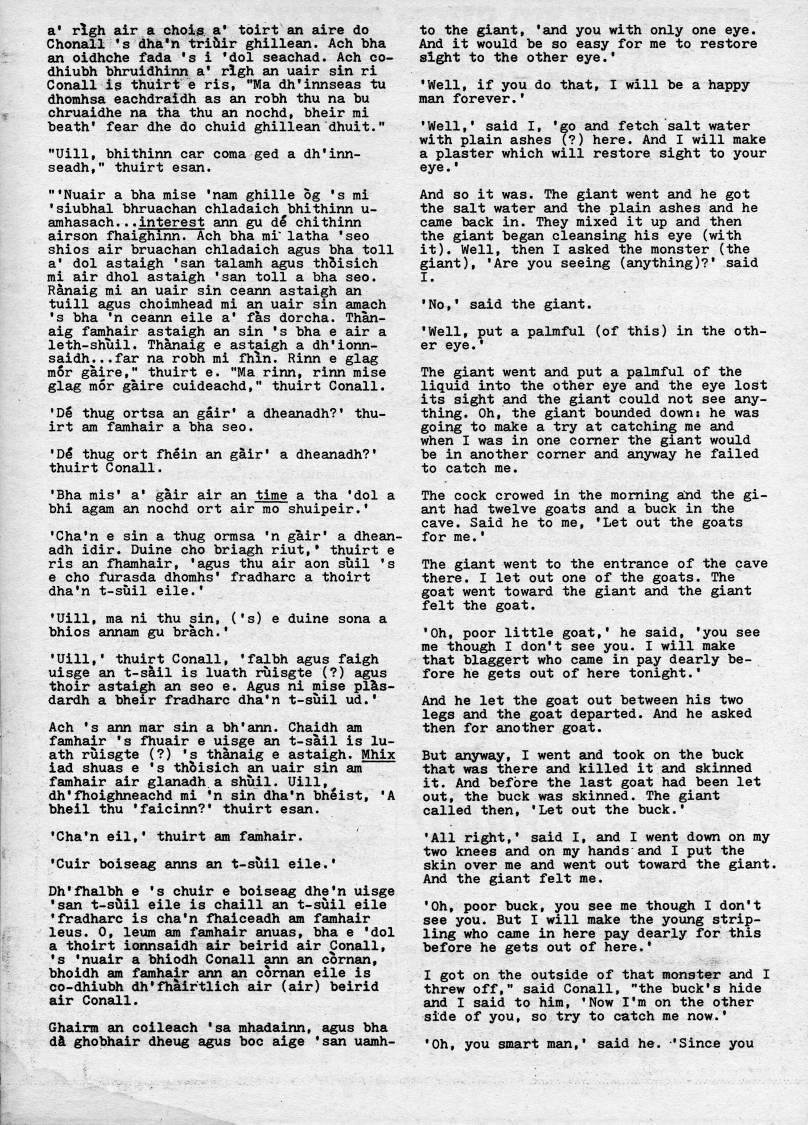a' righ air a chois a* toirt an aire do Chonall 's dha'n triuir ghillean. Ach bha an oidhche fada 's i 'dol seachad. Ach co- dhiubh bhruidhinn a' righ an uair sin ri Conall is thuirt e ris, "Ma dh'innseas tu dhomhsa eachdraidh as an robh thu na bu chruaidhe na tha thu an nochd, bheir mi beath' fear dhe do chuid ghillean dhuit." "Uill, bhithinn car coma ged a dh'inn- seadh," thuirt esan. "'Nuair a bha mise 'nam ghille og 's mi 'siubhal bhruachan chladaich bhithinn u- amhasach...interest ann gu de chithinn airson fhaighinn. Ach bha mi" latha 'seo shios air bruachan chladaich agus bha toll a' dol astaigh 'san talamh agus thbisich mi air dhol astaigh 'san toll a bha seo. Ranaig mi an uair sin ceann astaigh an tuill agus choimhead mi an uair sin amach 's bha 'n ceann eile a' fas dorcha. Than? aig famhair astaigh an sin 's bha e air a leth-shuil. Thanaig e astaigh a dh'ionn? saidh'. ..far na robh mi fhin. Rinn e glag mor gaire," thuirt e. "Ma rinn, rinn mise glag mor gaire cuideachd," thuirt Conall. 'De thug ortsa an gair* a dheanadh?' thu? irt am famhair a bha seo. 'D • thug ort fhein an gair' a dheanadh?' thuirt Conall. to the giant, 'and you with only one eye. And it would be so easy for me to restore sight to the other eye.' • Well, if you do that, I will be a happy man forever.' • Well,' said I, 'go and fetch "salt water with plain ashes (?) here. And I will make a plaster which will restore sight to your eye. • And so it was. The giant went and he got the salt water and the plain ashes and he came back in. They mixed it up and then the giant began cleansing his eye (with it). Well, then I asked the monster (the giant), • Are you seeing (anything) • ? said I. • No, said the giant. • Well, put a palmful (of this) in the oth? er eye.' The giant went and put a palmful of the liquid into the other eye and the eye lost its sight and the giant could not see any? thing. Oh, the giant bounded down: he was going to make a try at catching me and when I was in one comer the giant would be in another corner and anyway he failed to catch me. 'Bha mis' a' gair air an time a tha 'dol a bhi agam an nochd ort air mo shuipeir.' 'Cha'n e sin a thug ormsa 'n gair' a dhean? adh idir. Duine cho briagh riut, • thuirt e ris an fhamhair, 'agus thu air aon suil 's e cho furasda dhomhs' fradharc a thoirt dha'n t-suil eile.' 'Uill, ma ni thu sin, ('s) e duine sona a bhiOS annam gu brach.' 'Uill,' thuirt Conall, 'falbh agus faigh uisge an t-sail is luath ruisgte (?) agus thoir astaigh an seo e. Agus ni mise pl2is- dardh a bheir fradharc dha'n t-suil ud.' Ach 's ann mar sin a bh'ann. Chaidh am famhair 's fhuair e uisge an t-sail is lu? ath ruisgte (?) 's thanaig e astaigh. Mhix iad shuas e 's thbisich an uair sin am famhair air glanadh.a shuil. Uill, dh'fhoighneachd mi 'n sin dha'n bheist, 'A bheil thu 'faicinn?' thuirt esan. 'Cha'n oil,' thuirt am famhair. 'Cuir boiseag anns an t-silil eile.* Dh'fhalbh e 's chuir e boiseag dhe'n uisge 'san t-siiil eile is chaill an t-suil eile 'fradharc is cha'n fhaiceadh am famhair leus. 0, leum am famhair anuas, bha e 'dol a thoirt iojinsaidh air beirid air Conall, 's 'nuair a bhiodh Conall ann an cbrnan, bhoidh am famhair ann an cbrnan eile is co-dhiubh dh'fhairtlich air (air) beirid air Conall. Ghairm an coileach • sa mhadainn, agus bha d& ghobhair dheug agus boc aige 'san uamh- The cock crowed in the morning ajid the gi? ant had twelve goats and a buck in the cave. Said he to me, *Let out the goats for me. • The giant went to the entrance of the cave there. I let out one of the goats. The goat went toward the giant and the giant felt the goat. • Oh, poor little goat,' he said, 'you see me though I don't see you. I will make that blaggert who came in pay dearly be? fore he gets out of here tonight.' And he let the goat out between his two legs and the goat departed. And he asked then for another goat. But anyway, I went and took on the buck that was there and killed it and skinned it. And before the last goat had been let out, the buck was skinned. The giant called then, 'Let out the buck.' 'All right,' said I, and I went down on my two knees and on my hands and I put the skin over me and went out toward the giant. And the giant felt me. 'Oh, poor buck, you see me though I don't see you. But I will make the young strip? ling who came in here pay dearly for this before he gets out of here.' I got on the outside of that monster and I threw off," said Conall, "the buck's hide and I said to him, 'Now I'm on the other side of you, so try to catch me now.' 'Oh, you smart man,' said he. 'Since you