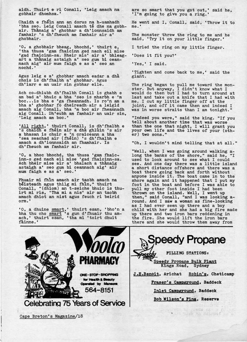 aidh. Thuirt e ri Conall, 'Leig amach na gobhair dhomhsa.' Chaidh e fhein ann an dorus na h-uamhadh 'bha seo. Leig Conall amach te dhe na gobh? air. Thanaig a' ghobhar a dh'ionnsaidh am famhair 's dh'fheuch am famhair air a' ghobhair. '0, a ghobhair bheag, bhochd,' thuirt e, 'tha thusa 'gam fhaicinn ged nach eil mise 'gad fhaicinn-sa. Bheir mis' air a' bhleag- art a thanaig astaigh a' seo gum bi cean- nach aig' air miim faigh e as a* seo an nochd.' Agus leig e a' ghobhar amach eadar a dha chois is dh'fhalbh a' ghobhar. Agus dh'iarr e an uair sin gobhar eile. Ach co-dhiubh dh'fhalbh Conall is ghabh e am bad a' bhuic a bha 'seo is mharbh e 'm boc...is bha e 'ga fheannadh. Is ro'n am a bha a' ghobhar fo dheireadh air a leigid amach aig Conall, bha 'm boc air fheannadh aig Conall. Dh'eubh am famhair an uair sin, 'Leig amach am boc' 'All right,' thuirt Conall, is dh'fhalbh e 's chaidh e fhein air a dha ghluin 's air a bhasan is chuir e *ji craiceann a bha 'sea seachad air (fhein) 's dh'fhalbh e amach a dh'ionnsaidh an fhamhair. Is dh'fheuch am famhair air. '0, a bhoc bhochd, tha thusa 'gam fhaic' inn-s ged nach eil mise 'gad fhaicinn-sa. Ach bheir mise air a' bhalach a thanaig astaigh a' seo gum bi ceannach aig' air mum faigh e as a' seo.' Fhuair mi fhin amach air taobh amach na beisteadh agus thilg mi fhin," thuirt Conall, "(dhiom) an t-seiche bhuic is thu? irt mi ris, 'Tha mi a nis' air an taobh amach dhiot an nist agus feuch ri beirid orm.' '0, a dhuine smart,' thuirt esan, 'bho'n a bha thu cho smart 's gun d'fhuair thu am? ach,' thuirt esan, 'tha mi 'toirt dhuit fainne.' are so smart that you got out,' said he, 'I'm going to give you a ring.' He went and I, Conall, said, me.' by 564-8161 'Throw it to The monster threw the ring to me and he said, 'Try it on your little finger.' I tried the ring on my little finger. 'Does it fit you?' • Yes,' I said. 'Tighten and come back to me,' giant. said the The ring began to pull me toward the mon? ster. But anyway, I didn't know what I would do then but I had to turn around at last and take out a knife that I had with me. I cut my little finger off at the joint, and off it came then and indeed I was in worse straits than I am tonight." "Indeed you were," said the king. "If you tell about another time that was worse than the one that night, I will grant you your own life and the lives of your (oth? er) two sons." "Oh, I wouldn't mind telling that at all." "Well, when I was going around walking a- long the banks of the shore," said he, "I used to look around to see what I could see. And one day there was a little island a short distance offshore and there was a boat there going back and forth without anyone inside it. The boat came in to the shore again and it happened that I put my foot in the boat ajid before I was able to pull my other foot inside I had been thrown on the island. Well, I went up then," said Conall, "and I was looking a- round. And I saw a woman as fine-looking as I had ever seen up there and a boy child with her and she had a big fire made up there and two iron bars reddening in the fire. She would lift the iron bars there and she would throw them away from CeldDrating 75 Years of Servioe Speedy Propane PILLING STATIONSt Speedy Propaine Bulk Plant Kings Road, Sydney J.E.Benoit. Arichat Robin's. Cheticamp Fraser*s Campground. Baddeck Inlet Campground. Baddeck Bob Wilson*'8 Fina. Reserve Cape Breton's Magazine/lS