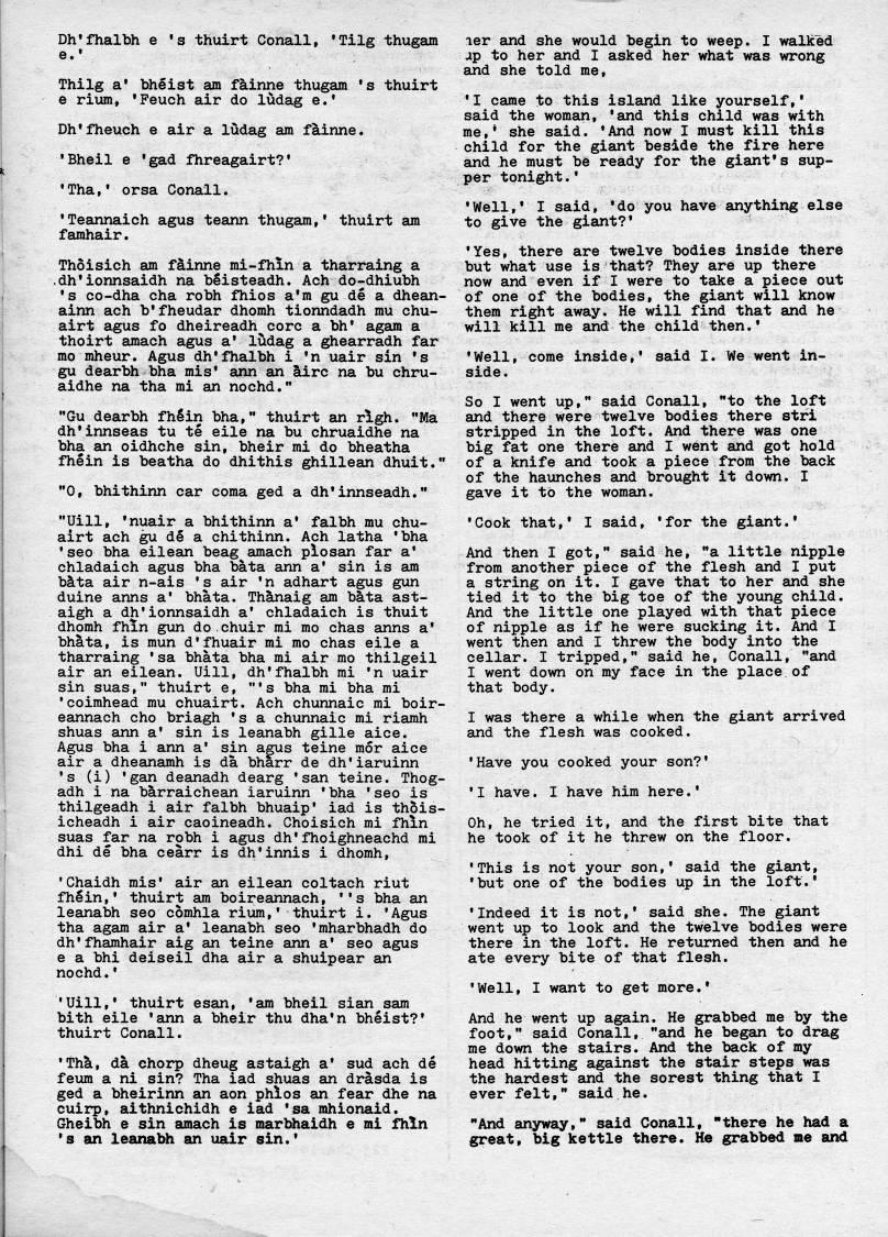 Dh'fhalbh e 's thuirt Conall, 'Tilg thugam e.' Thilg a' bheist am fainne thugam 's thuirt e rium, 'Feuch air do ludag e.' Dh'fheuch e air a ludag am fainne. • Bheil e 'gad fhreagairt?' 'Tha,' orsa Conall. 'Teannaich agus teann thugam,' thuirt am famhair. Thoisich am fainne mi-fhin a tharraing a ,dh'ionnsaidh na bSisteadh. Ach do-dhiubh 's co-dha cha robh fhios a'm gu de a dhean? ainn ach b'fheudar dhomh tionndadh mu chu- airt agus fo dheireadh core a bh' agam a thoirt amach agus a' ludag a ghearradh far mo mheur. Agus dh'fhalbh i 'n uair sin 's gu dearbh bha mis' ann an aire na bu chru? aidhe na tha mi an nochd." "Gu dearbh fhSin bha," thuirt an righ. "Ma dh'innseas tu te eile na bu chruaidhe na bha an oidhche sin, bheir mi do bheatha fhein is beatha do dhithis ghillean dhuit," "0, bhithinn car coma ged a dh'innseadh." "Uill, • nuair a bhithinn a* falbh mu chu- airt ach gu dg a chithinn. Ach latha 'bha 'seo bha eilean beag amach piosan far a' chladaich agus bha bata ann a' sin is am b'ta air n-ais 's air 'n adhart agus gun duine anns a' bhata. Thanaig am bata ast? aigh a dh'ionnsaidh a' chladaich is thuit dhomh fhin gun do chuir mi mo chas anns a' bhata, is mun d'fhuair mi mo chas eile a tharraing 'sa bhata bha mi air mo thilgeil air an eilean. Uill, dh'fhalbh mi 'n uair sin suas," thuirt e, "'s bha mi bha mi • coimhead mu chuairt. Ach chunnaic mi boir- eannach cho briagh 's a chunnaic mi riamh shuas ann a' sin is leanabh gille aice. Agus bha i ann a' sin agus teine mor aice air a dheanamh is da bharr de dh'iaruinn 's (i) 'gan deanadh dearg 'san teine. Thog- adh i na barraichean iaruinn 'bha 'seo is thilgeadh i air falbh bhuaip' iad is thbis- icheadh i air caoineadh. Choisich mi fhin suas far na robh i agus dh'fhoighneachd mi dhi de bha cearr is dh'innis i dhomh, • Chaidh mis' air an eilean coltach riut fh'in,' thuirt am boireannach, ''s bha an leanabh seo cbmhla rium,' thuirt i. 'Agus tha agam air a' leanabh seo 'mharbhadh do dh'fhamhair aig an teine ann a' seo agus e a bhi deiseil dha air a shuipear an nochd.' 'Uill,' thuirt esan, 'am bheil sian sam bith eile 'ann a bheir thu dha'n bheist?' thuirt Conall. 'Tha, da chorp dheug astaigh a' sud ach de feum a ni sin? Tha iad shuas an drasda is ged a bheirinn an aon phlos an fear dhe na cuirp, aithnichidh e iad 'sa mhionaid. Gheibh e sin amach is marbhaidh e mi fhin • s an leanabh an uair sin.* ler and she would begin to weep. I walked ap to her and I asked her what was wrong and she told me, • I came to this island like yourself, • said the woman, • and this child was with me,' she said. 'And now I must kill this child for the giant beside the fire here and he must be ready for the giant's sup? per tonight.' 'Well,' I said, 'do you have anything else to give the giant?' 'Yes, there are twelve bodies inside there but what use is that? They are up there now and even if I were to take a piece out of one of the bodies, the giant will know them right away. He will find that and he will kill me and the child then.' 'Well, come inside,' said I. We went in? side. So I went up," said Conall, "to the loft and there were twelve bodies there stri stripped in the loft. And there was one big fat one there and I went and got hold of a knife and took a piece from the back of the haunches and brought it down. I gave it to the woman. 'Cook that,' I said, 'for the giant.' And then I got," said he, "a little nipple from another piece of the flesh and I put a string on it. I gave that to her and she tied it to the big toe of the young child. And the little one played with that piece of nipple as if he were sucking it. And I went then and I threw the body into the cellar. I tripped," said he, Conall, "and I went down on my face in the place of that body. I was there a while when the giant arrived and the flesh was cooked. 'Have you cooked your son?' 'I have. I have him here.' Oh, he tried it, and the first bite that he took of it he threw on the floor. 'This is not your son,' said the giant, • but one of the bodies up in the loft. • • Indeed it is not,' said she. The giant went up to look and the twelve bodies were there in the loft. He returned then and he ate every bite of that flesh. • Well, I want to get more.' And he went up again. He grabbed me by the foot," said Conall, "and he began to drag me down the stairs. And the back of my head hitting against the stair steps was the hardest and the sorest thing that I ever felt," said he. "And anyway," said Conall, "there he had a great, big kettle there. He grabbed me and