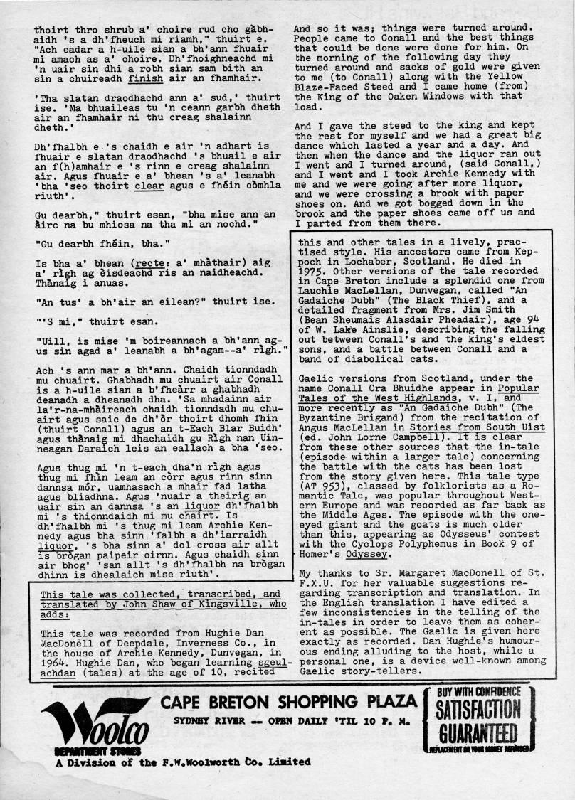 thoirt thro shrub a' choire rud cho gSibh- aidh 's a dh'fheuch mi riamh," thuirt e. "Ach eadar a h-uile sian a bh'ann fhuair mi amach as a* choire. Dh'fhoighneachd mi • n uair sin dhi a robh sian sam bith an sin a chuireadh finish air an fhamhair. • Tha slatan draodhachd ann a* sud,' thuirt ise. • Ma bhuaileas tu • n ceann garbh dheth air an fhamhair ni thu creag shalainn dheth. • Dh'fhalbh e 's chaidh e air • n adhart is fhuair e slatan draodhachd • s bhuail e air an f(h)amhair e 's rinn e creag shalainn air. Agus fhuair e a' bhean • s a* leanabh • bha 'seo thoirt clear agus e fhein cbmhla riuth' . Gu dearbh," thuirt esan, "bha mise ann an Sire na bu mhiosa na tha mi an nochd." "Gu dearbh fhein, bha." Is bha a* bhean (recte: a* mhathair) aig a* righ ag bisdeachd ris an naidheachd. Thanaig i anuas. "An tus* a bhlair an eilean?" thuirt ise. " • S mi," thuirt esan. "Uill, is mise 'm boireannach a bh'ann'ag- us sin agad a* leanabh a bh'agam • a' righ." Ach • & ann mar a bh'ann. Chaidh tionndadh mu chuairt. Ghabhadh mu chuairt air Conall is a h-uile sian a b'fhearr a ghabhadh deanadh a dheanadh dha. • Sa mhadainn air la'r-na-mhaireach chaidh tionndadh mu chu? airt agus saic de dh'br thoirt dhomh fhin (thuirt Conall) agus an t-Each Blar Buidh • agus thanaig mi dhachaidh gu Righ nan Uin? neagan Daraich leis an eallach a bha • 'seo. Agus thug mi • n t-each'dha'n righ agus thug mi fhin leam an cbrr agus rinn sinn dannsa mor, uamhasach a mhair fad latha agus bliadhna. Agus • nuair a theirig an uair sin an dannsa 's an li('uor dh'fhalbh mi 's thionndaidh mi mu chairt. Is dh'fhalbh mi 's thug mi leam Archie Ken? nedy agus bha sinn 'falbh a dh'iarraidh liquor, 's bha sinn a* dol cross air allt is br6gan paipeir oirnn. Agus chaidh sinn air bhog' 'san allt 's dh'fhalbh na brbgan dhinn is dhealaich mise riuth'. And so it was; things were turned around. People came to Conall and the best things that could be done were done for him. On the morning of the following day they turned around and sacks of gold were given to me (to Conall) along with the Yellow Blaze-Faced Steed and I came home (from) the King of the Oaken Windows with that load. And I gave the steed to the king and kept the rest for myself and we had a great big dance which lasted a year and a day. And then when the dance and the liquor ran out I went and I turned around, (said Conall,) and I went and I took Archie Kennedy with me and we were going after more liquor, and we were crossing a brook with paper shoes on. And we got bogged down in the brook and the paper shoes came off us and I parted from them there. This tale was collected, transcribed, and translated by John Shaw of Kmgsville, who adds; This tale was recorded from Hughie Dan MacDonell of Deepdale, Inverness Co., in the house of Archie Kennedy, Dunvegan, in 1964. Hughie Dan, who began learning sgeul- achdan (tales) at the age of 10, recited this and other tales in a lively, prac? tised style. His ancestors came from Kep- poch in Lochaber, Scotland. He died in 1975 • Other versions of the tale recorded in Cape Breton include a splendid one from Lauchie MacLellan, Dunvegan, called "An Gadaiche Dubh" (The Black Thief), and a detailed fragment from Mrs. Jim Smith (Bean Sheumais Alasdair Pheadair), age 94 of W. Lake Ainslie, describing the falling out between Conall • s and the king's eldest sons, and a battle between Conall and a band of diabolical cats. Gaelic versions from Scotland, under the name Conall Cra Bhuidhe appear in Popular Tales of the West Highlands, v. I, and more recently as "An Gadaiche Dubh" (The Byzantine Brigand) from the recitation of Angus MacLellan in Stories from South Uist (ed. John Lome Campbell). It is clear from these other sources that the in-tale (episode within a larger tale) concerning the battle with the cats has been lost from the story given here. This tale type (AT 953). classed by folklorists as a Ro? mantic Tale, was popular throughout West? ern Europe and was recorded as far back as the Middle Ages. The episode with the one- eyed giant and the goats is much older than this, appearing as Odysseus • contest with the Cyclops Polyphemus in Book 9 of Homer • s Odyssey. My thanks to Sr. Margaret MacDonell of St. F.X.U. for her valuable suggestions re? garding transcription and translation. In the English translation I have edited a few inconsistencies in the telling of the in-tales in order to leave them as coher? ent as possible. The Gaelic is given here exactly as recorded. Dan Hughie's humour? ous ending alluding to the host, while a personal one, is a device well-known among Gaelic story-tellers. jyS CAPE BRETON SHOPPING PLAZA STDNBT RIVBR • OIBN DAILT 'TIL 10 P. M. lUY WITH CONRDENCE SATISFAGTiON , mmxm LmFMCoIBii H.ilW MHn Mn'H A DiTision of the F.!f*W6olwocth Co. Linited