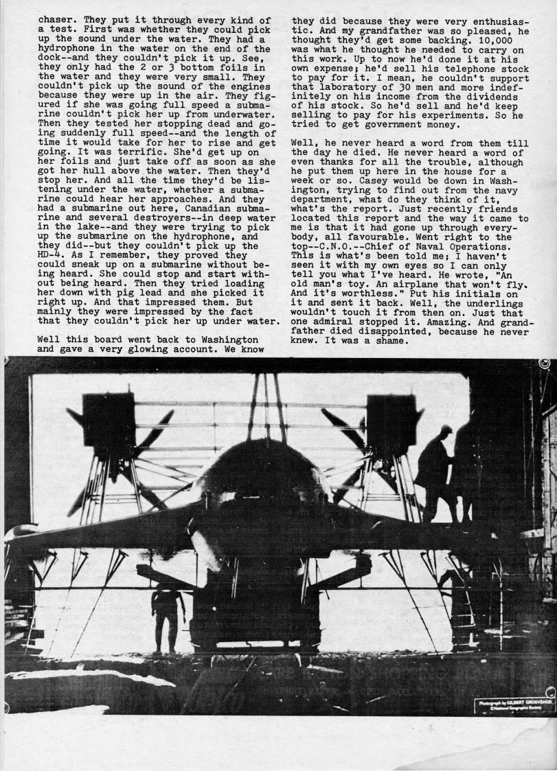 chaser. They put it through every kind of a test. First was whether they could pick up the sound under the water. They had a hydrophone in the water on the end of the dock • and they couldn't pick it up. See, they only had the 2 or 3 bottom foils in the water and they were very small. They couldn't pick up the sound of the engines because they were up in the air. They fig? ured if she was going full speed a subma? rine couldn't pick her up from underwater. Then they tested her stopping dead and go? ing suddenly full speed • and the length of time it would take for her to rise and get going. It was terrific. She'd get up on her foils and just take off as soon as she got her hull above the water. Then they'd stop her. And all the time they'd be lis? tening under the water, whether a subma? rine could hear her approaches. And they had a submarine out here, Canadian subma? rine and several destroyers • in deep water in the lake • and they were trying to pick up the submarine on the hydrophone, and they did • but they couldn't pick up the HD-4. As I remember, they proved they could sneak up on a submarine without be? ing heard. She could stop and start with? out being heard. Then they tried loading her down with pig lead and she picked it right up. And that impressed them. But mainly they were impressed by the fact that they couldn't pick her up under water. Well this board went back to Washington and gave a very glowing account. We know they did because they were very enthusias? tic. And my grandfather was so pleased, he thought they'd get some backing. 10,000 was what he thought he needed to carry on this work. Up to now he'd done it at his own expense; he'd sell his telephone stock to pay for it. I mean, he couldn't support that laboratory of 30 men and more indef? initely on his income from the dividends of his stock. So he'd sell and he'd keep selling to pay for his experiments. So he tried to get government money. Well, he never heard a word from them till the day he died. He never heard a word of even thanks for all the trouble, although he put them up here in the house for a week or so. Casey would be down in Wash? ington, trying to find out from the navy department, what do they think of it, what's the report. Just recently friends located this report and the way it came to me is that it had gone up through every? body, all favourable. Went right to the top • C.N.0. • Chief of Naval Operations. This is what's been told me; I haven't seen it with my own eyes so I can only tell you what I've heard. He wrote, "An old man's toy. An airplane that won't fly* And it's worthless." Put his initials on it and sent it back. Well, the underlings wouldn't touch it from then on. Just that one admiral stopped it. Amazing. And grand? father died disappointed, because he never knew. It was a shame.