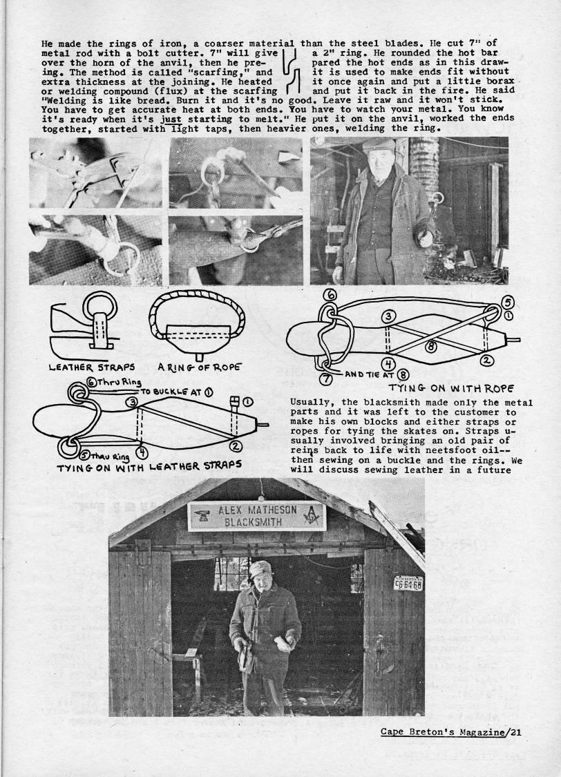 Published by Ronald Caplan on 1973/3/1 (652 reads)jid U n 2" ring. He rounded the hot bar pared the hot ends as in this draw- it is used to make ends fit without it once again and put a little borax and put it back in the fire. He said He made the rings of iron, a coarser material' than the steel blades. He cut 7" of metal rod with a bolt cutter, 7" will g" over the horn of the anvil, then he pre* ing. The method is called "scarfing," and extra thickness at the joining. Ke heated or welding compound (flux) at the scarfing "Welding is like bread. Burn it and it's no good. Leave it raw and it won't stick. You have to get accurate heat at both ends. You have to watch your metal. You know it's ready when it's just starting to melt." He put it on the anvil, worked the ends together, started with light taps, then heavier ones, welding the ring. • ' ;. '" • • "??' • • -fM r 'm UeATHfiR, 5TR.AP5 A KjK ' OF "ROPe" TYlK