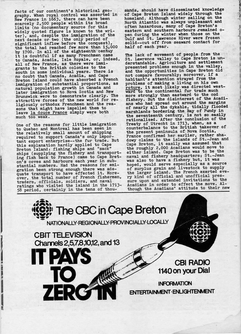 facts of our continent's historical geo? graphy. When royal control was asserted in New France in I663, there can have been scarcely 2,500 people within its broad limits (no documentary source for this widely quoted figure is known to the wri? ter), and, despite the immigration of the next decade or two (the only period of significant inflow before the conquest), the total had reached few more than 15,000 by 1700. In all of the eighteenth centuy it is doubtful if as many Frenchmen came to Canada, Acadia, Isle Royale, or, indeed, all of New France, as there were immi? grants to the British colonies to the south in some individual years. There is no doubt that Canada, Acadia, and Cape Breton Island could have absorbed a French immigration of substantial proportions, as natural population growth in Canada and later immigration to Nova Scotia and New Brunswick were to demonstrate clearly. The attractive forces of the new world for re? ligiously orthodox Frenchmen and the rea? sons that might have impelled them to leave la douce France simply were both much too weak. One of the reasons for little immigration to Quebec and Montreal has been seen in the relatively small amount of shipping required to support Canada's only impor? tant export enterprise • the fur trade. But this explanation hardly applied to Cape Breton Island: fishing ships and "sack" ships (supplying the fishery and transport? ing fish back to France) came to Cape Bret? on's coves and harbours each year in sub? stantial niMbers. Had the reasons for emi? gration been strong enough there was ade? quate transport to have effected it. More? over, the total number of French fishermen, traders, officials, soldiers, and naval ratings who visited the island in the 1713- 58 period, certainly in the tens of thou? sands, should have disseminated knowledge of Cape Breton Island widely through the homeland. Although winter sailing on the North Atlantic was always unpleasant and often hazardous, many of Cape Breton's eastern and southern harbours xemained o- pen during the winter when those on the Gulf and St. Lawrence River were frozen solid • cut off from seaward contact for half of each year. The lack of movement of people from the St. Lawrence valley to Cape Breton is un? derstandable. Agriculture and settlement presented problems enough in the valley, and the opportunities in Cape Breton did not compare favourably; moreover, if a habitant's attention strayed from the problems of making a living on his own roture, it most likely was directed west- ward to the continental fur trade much more strongly than eastward to the cod fishery. But the disinterest of the Acadi? ans who had spread out around the margins of nearly all the dykable, tidally flooded marshlands bordering the Bay of Fundy in the seventeenth century, is not so easily rationalized. After the conclusion of the Treaty of Utrecht in 1713?? when, as a counterbalance to the British takeover of the present peninsula of Nova Scotia, France confirmed her earlier, rather sha? dowy claims to the islands of St.-Jean and Cape Breton, it easily was assumed that the roughly 2,000 Acadians would move to either island. Cape Breton was to be the naval and fishery headquarters; St.-Jean was also to have a fishery but, it was hoped, would serve especially as a source of surplus grain and livestock to supply the larger island. The French exerted eve? ry kind of official and unofficial pres? sure upon and extended invitations to the Acadians in order to effect the move. Al? though the Acadians' attitude to their new i'i' k USJr The CBC in Cape Breton NATIONALLYREGIONALLYPROVINCIALLYLDCALLY CBITTELEVISION Channels 2,5,7,8,10,12, and 13 iTivars TO ZE CBI RADIO 1140 on your Dial INFORMATION ENTERTAINMENTENLIGHTENMENT
