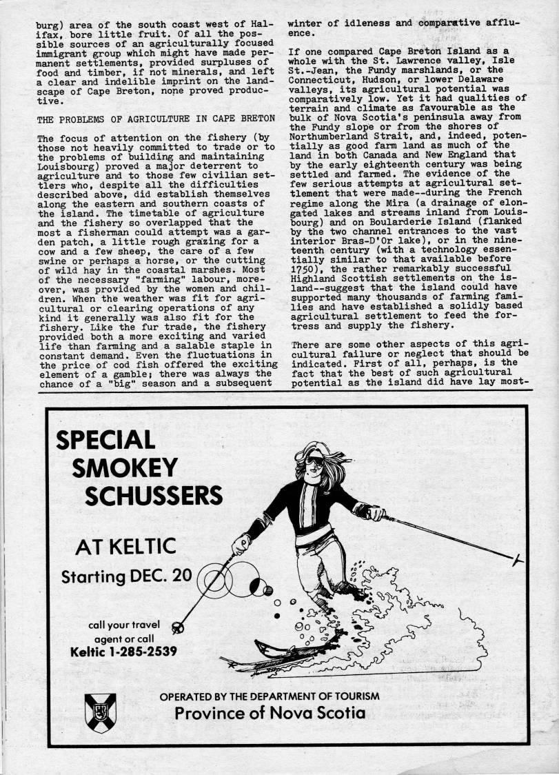 burg) area of the south coast west of Hal? ifax, bore little fruit. Of all the pos? sible sources of an agriculturally focused immigrant group which might have made per? manent settlements, provided surpluses of food and timber, if not minerals, and left a clear and indelible imprint on the land? scape of Cape Breton, none proved produc? tive. THE PROBLEMS OF AGRICULTURE IN CAPE BRETON The focus of attention on the fishery (by those not heavily committed to trade or to the problems of building and maintaining Louisbourg) proved a major deterrent to agriculture and to those few civilian set? tlers who, despite all the difficulties described above, did establish themselves along the eastern and southern coasts of the island. The timetable of agriculture and the fishery so overlapped that the most a fisherman could attempt was a gar? den patch, a little rough graizing for a cow and a few sheep, the care of a few swine or perhaps a horse, or the cutting of wild hay in the coastal marshes. Most of the necessary "farming" labour, more? over, was provided by the women and chil? dren. When the weather was fit for agri? cultural or clearing operations of any kind it generally was also fit for the fishery. Like the fur trade, the fishery provided both a more exciting and varied life than fanning and a salable staple in constant demand. Even the fluctuations in the price of cod fish offered the exciting element of a gamble; there was always the chance of a "big" season and a subsequent winter of idleness and comparative afflu? ence. If one compared Cape Breton Island as a whole with the St. Lawrence valley, Isle St.-Jean, the Fundy marshlands, or the Connecticut, Hudson, or lower Delaware valleys, its agricultural potential was comparatively low. Yet it had qualities of terrain and climate as favourable as the bulk of Nova Scotia's peninsula away from the Fundy slope or from the shores of Northumberland Strait, and, indeed, poten? tially as good farm land as much of the land in both Canada and New England that by the early eighteenth century was being settled and farmed. The evidence of the few serious attempts at agricultural set? tlement that were made • during the French regime along the Mira (a drainage of elon? gated lakes and streams inland from Louis? bourg) and on Boularderie Island (flanked by the two channel entrances to the vast interior Bras-D'Or lake), or in the nine? teenth century (with a technology essen? tially similar to that available before 1750), the rather remarkably successful Highland Scottish settlements on the is? land • suggest that the island could have supported many thousands of farming fami? lies and have established a solidly based agricultural settlement to feed the for? tress and supply the fishery. There are some other aspects of this agri? cultural failure or neglect that should be indicated. First of all, perhaps, is the fact that the best of such agricultural potential as the island did have lay most- SPECIAL SMOKEY SCHUSSERS AT KELTIC Storting DEC. 20 call your travel agent or call Keltic 1-285-2539 OPERATED BY THE DEPARTMENT OF TOURISM Province of Nova Scotia