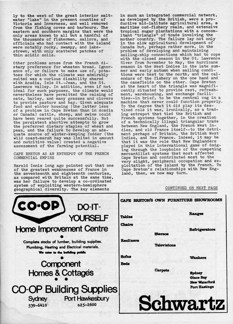 ly to the west of the great interior salt? water "lake" in the present counties of Victoria and Inverness, and well removed ??from the fishing coves and harbours. The eastern and southern margins that were the only areas known to all but a handful of the thousands of fishermen, sailors, and officials who had contact with the island were notably rocky, swampy, and lake- strewn, with only scattered patches of thin acidic soils. Other problems arose from the French di? etary preference for wheaten bread. Ignor? ance of, or failure to make use of, pota? toes for which the climate was admirably suited was a curious disability shared with Acadia, Isle St.-Jean, and the St. Lawrence valley. In addition, even if not ideal for such purposes, the climate would nevertheless have permitted the raising of oats, barley, and many grasses and clovers to provide pasture and hay. Given adequate food and winter housing (the latter less of a problem in Cape Breton than in Acadia or Canada) cattle, sheep, and swine could have been reared quite successfully. But the persistent abortive attempts to grow the preferred dietary staples of wheat and peas, and the failure to develop an ade? quate source of.winter-keeping fodder (the wild coast-marsh hay was limited in amount and nutritive value) created a negative assessment of the farming potential. CAPE BRETON AS AN ENTREPOT OF THE FRENCH COMMERCIAL EMPIRE Harold Innis long ago pointed out that one of the greatest weaknesses of France in the seventeenth and eighteenth centuries, as compared with Britain at the same time, was her failure to develop a co-ordinated system of exploiting western-hemisphere geographical diversity. The key elements in such an integrated commercial network, as developed by the British, were a pro? ductive mid-latitude agricultural area, a maritime cod-fishery realm, and extensive tropical sugar plantations with a concom? itant "triangle" of trade involving the mother country. The failure lay not only in the slow agricultural development of Canada but, perhaps rather more, in the problem of developing and maintaining sailing-ship connections which had to cope with the closed season in the St. Lawrence River from November to May, the hurricane season in the West Indies in the late sum? mer and early autumn when sailing condi? tions were best to the north, and the cal? endars of the fishery on the one hand and the canefields on the other. Cape Breton at the heart of the triangle was magnifi? cently situated to provide rest, refresh? ment, warehousing, and exchange facili? ties • in brief, to be the central cog in a machine that never could function properly. To the degree that it did play its des? tined role it was, ironically, as a trad? ing entrepot that tied the British and French systems together, in the creation of a technically illegal triangular trade between New England, the French West In? dies, and old France itself • to the detri? ment perhaps of Britain, the British West Indies, and New France. Indeed, it may be that it was the role that New Englanders played in this international game of dodg? ing through the loopholes of the competing mercantilist systems that most affected Cape Breton and contributed most to the very slight, peripheral occupation and ex? ploitation of the island by the French. To Cape Breton's relationships with New Eng? land, then, we now may turn. CONTINUED ON NEXT PAGE CO-OP) DO-IT- YOURSELF Home Improvement Centre • Complete stocks of lumber, building supplies. Plumbing, Heating and Electrical materials. wwm cnvr iv mw uwiiMiiiy pwonc Component Homes & Cottages CO-OP Building Supplies Sydney Port Hawkesbury 539-6410- 625-2600 CAFE BRETON' OWN FURNTFUBE SHOWROOMS Ranges TaUes Ghairii Rediners Sofas Beds stereos Televisions Carpets Refrigerators Washers Sydney CHaoeBay NewWkterford Pbrt Hastings Schwartz