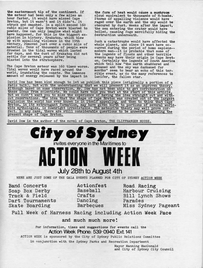 Published by Ronald Caplan on 1979/6/1 (615 reads)the easternmost tip of the continent. If the meteor had been only a few miles an hour faster, it would have missed Cape Breton, but it wasn't and it didn't. It struck and smashed. In a split second l60 cubic miles of Cape Breton were blasted to powder. One can only imagine what might have happened, for this is the biggest ex? plosion in history. Krakatoa, which blew up with appalling violence in the 19th century, removed just over a cubic mile of material. Tens of thousands of people were drowned in the tidal waves which lasted for days, and the dust of Krakatoa did not settle for several years after being blasted into the stratosphere. The Cape Breton meteor was 160 times worse. Tidal waves would have raced around the world, inundating the coasts. The immense amount of energy released by the impact in the form of heat would cause a mushroom cloud equivalent to thousands of H-bombs. Storms of appalling violence would have raged over the earth and the sky would be obscured by dust. Weeks after the impact, the sea entering the crater would have boiled, causing fogs mercifully hiding the destruction underneath. Such a catastrophe would have affected the whole planet, and since it must have oc? curred during the period of homo sapiens • modern man • it is probable that some of the legends of floods and other terrible events may have their origin in Cape Bret? on. Certainly the legends of South America which tell how "the earth shuddered and groaned and the sky was darkened for months" seem to bear an echo of this ter? rible event, as do the many references to Lucifer, the fallen star. David Dow has been kind enough to let us publish this piece (originally a portion of a radio talk), but with the understanding that we will present it as an unproven theory? Although based on some observation, Mr. Dow has not 'Q'n able to get corroboration on these ideas from scientists. We could have told you that at the start of this article, but we didn't want you to miss the experience of having the idea straight out and with? out reservations. The idea that the shape of Cape Breton was created out of the largest explosion the world has eyer known is in itself appealing, and then to think that Cape" Breton, in its extravagant formation, may have given birth to portions of several world? wide mythologies, is downright irresistable. The meteorite theory may well prove cor- rect. In any case, there are still considerable questions to be answered regarding the present shape of Cape Breton." David Dow is the author of the novel of Cape Breton, THE CLIFFHANGER HOUSE. City of Sydney invites everyone in the Maritimes to ACTION WEEK July 28th to August 4th HERE ARE JUST SOME OF THE GALA EVENTS PLANNED FOR CITY OF SYDNEY ACTION WEEK Band Concerts Soap Box Derby Track & Field Dart Tournaments Skate Boarding Actionfest Baseball Crafts Dancing Barbecues Road. Racing Harbour Cruising Bill Lynch Shows Parades Miss Sydney Pageant Full Week of Harness Racing including Action Week Pace and much much more! For information, times and suggestions for events call the Action Wfeek Phone: 5390940 Ext. 141 ACTION WEEK is sponsored by the City of Sydney Public Relations Committee in conjunction with the Sydney Parks and Recreation Department Mayor Manning MacDonald and City of Sydney City Council