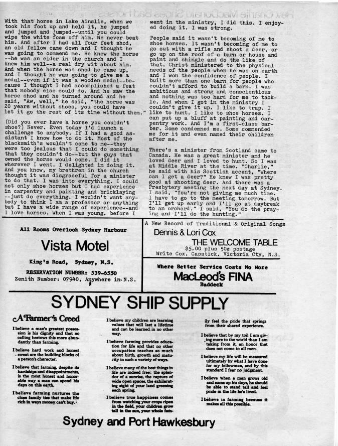 Published by Ronald Caplan on 1979/6/1 (317 reads)With that horse in Lake Ainslie, when we took his foot up and held it, he jumped and ji;imped and jumped • until you could wipe the white foam off him. We never beat him. And after I had all four feet shod, an old fellow came down and I thought he was going to commend me. He knew the horse • he was an elder in the church and I knew him well • a real dry wit about him. And when the horse was shod he came up, and I thought he was going to give me a medal • even if it was a wooden medal • be? cause I thought I had accomplished a feat that nobody else could do. And he saw the horse shod and he turned around and he said, "Aw, well," he said, "the horse was 20 years without shoes, you could have let it go the rest of its time without them. (Did you ever have a horse you couldn't shoe?) Never. Even today I'd launch a challenge to anybody. If I had a good as? sistant I know how to do it. Most of the blacksmith's wouldn't come to me • they were too jealous that I could do something that they couldn't do • but the guys that owned the horse would come. I did it wherever I went. I delighted in doing it. And you know, my brethren in the church thought it was disgraceful for a minister to do that. I was into everything. I could not only shoe horses but I had experience in carpentry and painting and bricklaying • just do everything. I wouldn't want any? body to think I am a professor or anything but I have a wide range of experience • and I love horses. When I was young, before I went in the ministry, I did this. I enjoy? ed doing it. I was strong. People said it wasn't becoming of me to shoe horses. It wasn't becoming of me to go out with a rifle and shoot a deer, or go up on the roof of a barn or house and paint and shingle and do the like of that. Christ ministered to the physical needs of the people when he was on earth and I won the confidence of people. I built more than one barn for people who couldn't afford to build a barn. I was ambitious and strong and conscientious and nothing was too hard for me to tack? le. And when I got in the ministry I couldn't give it up. I like to trap. I like to hunt. I like to shoe horses. I can put up a bluff at painting and car? pentry work. And I'm a first-class bar? ber. Some condemned me. Some commended me for it and even named their children after me. There's a minister from Scotland came to Canada. He was a great minister and he • loved deer and I loved to hunt. So I was at Middle River at the time. "Charlie," he said with his Scottish accent, "Where can I get a deer?" He knew I was pretty good at shooting deer. And there was a Presbytery meeting the next day at Sydney. I said, "You're not giving me much time. I have to go to the meeting tomorrow. But I'll get up early and I'll go at daybreak to an orchard." I said, "You do the pray? ing and I'll do the hunting." All Rooms Overlook Sydney Harbour Vista Motel Kill's Road, Sydney, N.S. RBSBRVAXIQN NUMBER: 539-6550 Zenith Number: 07940, Anywhere in*N.S. A New Record of Traditional & Original Songs Dennis & Lori Cox THE WELCOME TABLE $5.00 plus 500 postage Write Cox. Capstick. Victoria Cty, N.S. Where Better Service Costs No More MacLeod's RNA Baddeek SYDNEY SHIP SUPPLY cA'Bumer' Creed Ibelieve a man's greatest po?8e??> sion is his dignity and tiiat no calling bestows this more abun? dantly than farming. Ibelieve hard work and honest . sweat are the building blocks of a person's character. I believe &at; farming; despite its hardships and disappointments' is the most honest and honor- aUe way a man can speod his days on this earth. Ibelieve farming nurtures the close family ties tiiat make liife rich in wmy money can*t buy.?? I believe my children are learning values that will last a lifetime and can be learned, in no other way. I believe farming provides ediica' tion for life and that no other occupation teaches so much about birth, growth and matu? rity in such a variety of ways. I believe many of the best things in life are indeed free: the splen? dor of a sunrise, tb?? raptive of wide open spaces, the exhilarat? ing sight <' your land greening eaoa spcingi Ibelieve true happiness comes from watcfasag your crops ripen in tiie field, your diildren grow tall in tiie suiw your n'kole late- ily feel the pride that springs from their shared experience. I believe that by my toil I am giv- .ing more to the world than I am taking from it, an honor that does not come to all men. I believe my life will be measured ultimately by what I have done for my fellowman, and by this standard I fear no judgment Ibelieve when a man grows old and sums up his day% he should be able to stand tall and feel pride in the life he's lived. Ibelieve in farming because it makes all tiiis possible. Sydney and Port Hawkesbury