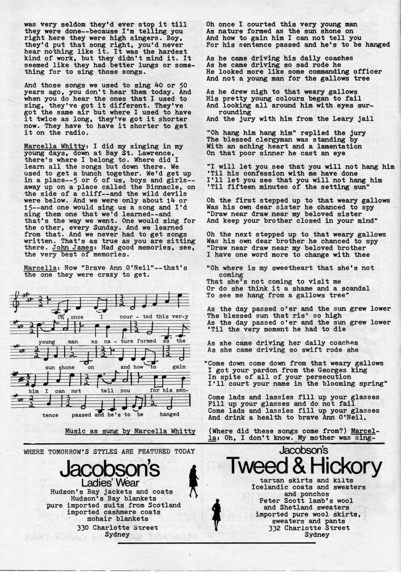 Published by Ronald Caplan on 1979/8/1 (261 reads)was very seldom they'd ever stop it till they were done • because I'm telling you right here they were high singers. Boy, they'd put that song right, you'd never hear nothing like it. It was the hardest kind of work, but they didn't mind it. It seemed like they had better lungs or some? thing for to sing those songs. And those songs we used to sing 40 or 50 years ago, you don't hear them today. And when you do hear the ones that 1 used to sing, they've got it different. They've got the same air but where I used to have it twice as long, they've got it shorter now. They have to have it shorter to get it on the radio. Marcella Whitty: I did my singing in my young days, down at Bay St. Lawrence, there's where I belong to. Where did I learn all the songs but down there. We used to get a bunch together. We'd get up in a place • 5 or 6 of us, boys and girls • away up on a place called the Binnacle, on the side of a cliff • and the wild devils were below. And we were only about l4 or 15 • and one would sing us a song and I'd sing them one that we'd learned • and that's the way we went. One would sing for the other, every Sunday. And we learned from that. And we never had to get songs written. That's as true as you are sitting there. John James; Had good memories, see, the very best of memories. Marcella; Now "Brave Ann O'Neil" • that's the one they were crazy to get. tence passed and he's to be hanged Music as sung by Marcella Whitty Oh once I courted this very young man As nature formed as the sun shone on And how to gain him I can not tell you For his sentence passed and he's to be hanged As he came driving his daily coaches As he came driving so sad rode he He looked more like some commanding officer And not a young man for the gallows tree As he drew nigh to that weary gallows His pretty young colours began to fail And looking all aroxmd him with eyes sur? rounding And the jury with him from the Leary jail "Oh hang him hang him" replied the jury The blessed clergyman was standing by With an aching heart and a lamentation On that poor sinner he cast an eye "I will let you see that you will not hang him 'Til his confession with me have done I'll let you see that you will not hang him • Til fifteen minutes of the setting sun" Oh the first stepped up to that weary gallows Was his own dear sister he chanced to spy "Draw near draw near my beloved sister And keep your brother closed in your mind" Oh the next stepped up to that weary gallows Was his own dear brother he chanced to spy "Draw near draw near my beloved brother I have one word more to change with thee "Oh where is my sweetheart that she's not coming That she's not coming to visit me Or do she think it a shame and a scandal To see me hang from a gallows tree" As the day passed o'er and the sun grew lower The blessed sun that ris' so high As the day passed o'er and the sun grew lower 'Til the very moment he had to die As she came driving her daily coaches As she came driving so swift rode she "Come down come down from that weary gallows I got your pardon from the Georges king In spite of all of your persecution I'll court your name in the blooming spring" Come lads and lassies fill up your glasses Fill up your glasses and do not fail Come lads and lassies fill up your glasses And drink a health to brave Ann O'Neil, (Where did these songs come from?) Marcel? la; Oh, I don • t know. My mother was 'ing- WHERE TOMORROW'S STYLES ARE FEATURED TODAY Jac(?)Son's Lacdies' Wear Hudson's Bay jackets and coats Hudson's Bay blankets pure imported suits from Scotland imported cashmere coats mohair blankets 330 Charlotte axreet Sydney J I Jacobson's Twee(j & Hickory tarxan skirts and kilts Icelandic coats and sweaters and ponchos Peter Scott lamb's wool and Shetland sweaters imported pure wool skirts, sweaters and pants 332 Charlotte Street Sydney