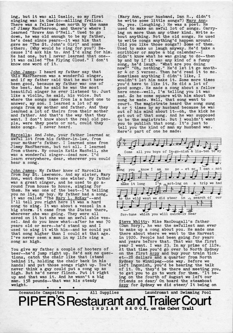 ing, but it was all Gaelic, so my first singing was in Gaelic • milling frolics. There was a fellow down north by the name of Jimmy MacPherson, and there's where I learned "Brave Ann O'Neil." Used to go down, he was old enough to be my father, he's dead since years • it was him that gave me "The St. John's Girl" and some others. (Why would he sing for you?) Be? cause I'd ask him to. And I'd sing for him. He had one, but I never learned that one • it was called "The Flying Cloud." I don't know one word of it. John James; I heard my father say that this MacPherson was a wonderful singer, and if my father said that he must have been good, because my father was one of the best. And he said he was the most beautiful singer he ever listened to. Just like a violin, he said, his voice. But where the songs came from is a hard one to answer, my son. I learned a lot of my songs from my mother and father. And they learned a lot of theirs from their mother and father. And that's the way that they went. I don't know about the real old peo? ple, were they poets or not, could they make songs. I never heard. Marcella; And John, your father learned ar. awful lot from his father-in-law, from your mother's father. I learned some from Jimmy MacPherson, but not all. I learned from others. My cousin Katie MacNeil, she was a wonderful singer • dead now. I'd learn everywhere, dear, wherever you could hear a song. John James; My father knew of Marcella from Bay St. Lawrence. And my sister, Mary Ann, went down there one winter. My father was a great singer, and he used to go a- round from house to house, singing for them. He was one of the best • I'm telling you no lie, my boy. My father had a song, it was called "The Mary L. McKav" • and I'll tell you right here it was a hard song to sing. It was about a vessel in a big storm. It came from the States there, wherever she was going. They were all saved on it but she was an awful able ves? sel. And do you know what • after he was 70 years old or more • he'd stand up and I used to sing it with him • and he could put that song higher than I could at that age. I've never seen a man in my life sing a song as high. You give my father a couple of hooters of beer • he'd jump right up. He'd ask no ques? tions, catch the chair like that (stand behind it, holding the chair back in his hands) and put those songs right up. You'd never think a guy could put a song up as high. But he'd never flinch. Put it right up and that was it. And he wasn't a big man. 158 pounds • that was his steady weight. (Mary Ann, your husband, Dan R., didn't he write some little songs?) Mary Ann; Oh, yes. (Laughing.) He was a poet. He used to make an awful lot of songs. Carry? ing on more than any other kind. Write a- bout anything. Not the old songs. He used to write songs anything'd happen around. (Did you like those songs?) Some of them. Used to make us laugh anyway. He'd take a scribbler or maybe a big calendar • I didn't know what he was going to do • then by and by if it was any kind of a funny song, he'd laugh. "What are you doing now?" "Oh, nothing." He'd let it go anoth? er 4 or 5 verses. Then he'd read it to me. Sometimes anything I didn't like, I wouldn't let him make it. Some more times you'd have to like it, He did a lot of good songs. He made a song about a fellow here once • well, I'm telling you it was sad. So he come square with him about the song he made. Well, that song went to court. The magistrate heard the song sung 4 or 5 times by my husband because he was out of his mind about it • oh, the kick he got out of that song. And he was supposed to be the magistrate. But I wouldn't want you to publish that song. It's just to tell you the kind of man my husband was. Here's part of one he made; for-tune which you will quick-ly hear Steve Whitty; Mike MacDougall's father (Dan Rory), he was the awfullest man ever to make up a song about you. He made one there about Where we went to the Harvest in 1920. People had been going for years and years before that. That was the first year I went. I was 23. In my prime of life. At that time you'd go over to North Sydney on the first Aspy and buy your train tick? et • 28 dollars and a quarter from North Sydney to Winnipeg • one way. Before we left Ingonish, you'd be hearing the talk of it. Oh, they'd be there and meeting you, to get you to go to work for them. "It be? ing on the fourth of August we left our friends so dear/ On board the steamboat Aspy for Sydney we did steer/ It being on Oceanside Campsites All Supplies Laundromat and Swimming Pool PI PER'S Restaurant and Trailer Court INDIAN BROOK, on the Cabot Trail