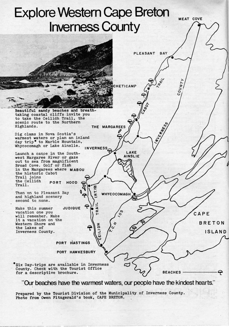 Published by Ronald Caplan on 1979/8/1 (287 reads)Explore Western Cape Breton Inverness County MEAT COVE PLEASANT BAY CHETICAMP Beautiful sandy beaches and breath? taking coastal cliffs invite you to take the Ceilidh Trail, the scenic route to the Northern Highlands. Dig clams in Nova Scotia's warmest waters or plan an inland day trip* to Marble Mountain, Whycocomagh or Lake Ainslie. MARGA Launch a canoe in the South? west Margaree River or gaze out to sea from magnificent Broad Cove. Golf or fish in the Margarees where MABOU the historic Cabot Trail joins the Ceilidh Trail. PORT HOOD Then on to Pleasant Bay and highland scenery second to none. Make this summer vacation one you will remember. Make it a vacation on the Western Shore and the Lakes of Inverness County. JUDIQUE PORT HASTINGS PORT HAWKESBURY *Six Day-trips are available in Inverness County. Check with the Tourist Office for a descriptive brochure. VERNESS, "Our beaches have the warmest waters, our people have the kindest hearts." Prepared by the Tourist Division of the Municipality of Inverness County. Photo from Owen Fitzgerald's book, CAPE BRETON.