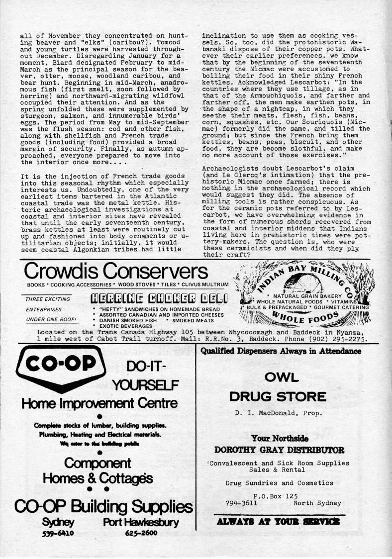 Published by Ronald Caplan on 1979/12/1 (319 reads)all of November they concentrated on hunt? ing beaver and "elks" (caribou?). Tomcod and young turtles were harvested through? out December. Disregarding January for a moment, Biard designated February to mid- March as the principal season for the bea? ver, otter, moose, woodland caribou, and bear hunt. Beginning in mid-March, anadro- mous fish (first smelt, soon followed by herring) and northward-migrating wildfowl occupied their attention. And as the spring unfolded these were supplemented by sturgeon, salmon, and innumerable birds' eggs. The period from May to mid-September was the flush season: cod and other fish, along with shellfish and French trade goods (including food) provided a broad margin of security. Finally, as autumn ap? proached, everyone prepared to move into the interior once more.. . . It is the injection of French trade goods into this seasonal rhythm which especially interests us. Undoubtedly, one of the very earliest items bartered in the Atlantic coastal trade was the metal kettle. His? toric archaeological investigations at coastal and interior sites have revealed that until the early seventeenth century, brass kettles at least were routinely cut up and fashioned into body ornajiients or u- tilitarian objects; initially, it would seem coastal Algonkian tribes had little inclination to use them as cooking ves? sels. So, too, did the protohistoric Wa? banaki dispose of their copper pots. What? ever their earlier preferences, we know that by the beginning of the seventeenth century the Micmac were accustomed to boiling their food in their shiny French kettles. Acknowledged Lescarbot: "In the countries where they use tillage, as in that of the Armouchiquois, and farther and farther off, the men make earthen pots, in the shape of a nightcap, in which they seethe their meats, flesh, fish, beans, corn, squashes, etc. Our Souriquois (Mic? mac) formerly did the same, and tilled the ground; but since the French bring them kettles, beans, peas, biscuit, and other food, they are become slothful, and make no more account of those exercises." Archaeologists doubt Lescarbot's claim (and Le Clercq's intimation) that the pre? historic Micmac once farmed; there is nothing in the archaeological record which would suggest they did. The absence of milling tools is rather conspicuous. As for the ceramic pots referred to by Les? carbot, we have overwhelming evidence in the form of numerous sherds recovered from coastal and interior middens that Indians living here in prehistoric times were pot? tery-makers. The question is, who were these ceramicists and when did they ply their craft? Crowdis Conservers 4lP''if BOOKS * COOKING ACCESSORIES * WOOD STOVES * TILES * CLIVUS MULTRUM ~'i' ' W'W' i'' A ' ''M) M • ?...xc, • . gjobbijuje mmm mLj ENTERPRISES * "HEFTY" SANDWICHES ON HOMEMADE BREAD • ASSORTED CANADIAN AND IMPORTED CHEESES UNDER ONE ROOF! * DANISH SMOKED FISH * SMOKED MEATS EXOTIC BEVERAGES ' 'la * NATURAL GRAIN BAKERY ??' iif* WHOLE NATURAL FOODS * VITAMINSli _ BULK & PREPACKAGED * GOURMET CATERING' Located on the Trans Canada Highway 105 between Whycocomagh and Baddeck in Nyanza, 1 mile west of Cabot Trail turnoff. Mail: R.R.No. 3, Baddeck. Phone (902) 295-2275. CO-OP DO-IT- YCXJRSELF Home Improvement Centre # Compiato stocks of kimber, building supplies. Plumbing, HMting md Bactcical materials. m Component Homes & Cottages CO-OP Building Supplies S/ckriey R)rt HaiAtosbury 539-6410 625-2600 Qualified Dispensers Always in Attendance OWL DRUGSTORE D. I. MacDonald, Prop. Yonr Northside DOROTHY GRAY DISTRIBUTOR 'Convalescent and Sick Room Supplies Sales & Rental Drug Sundries and Cosmetics P.O.Box 125 79'-3611 North Sydney ALWAYS AT TODB 8EKVKX