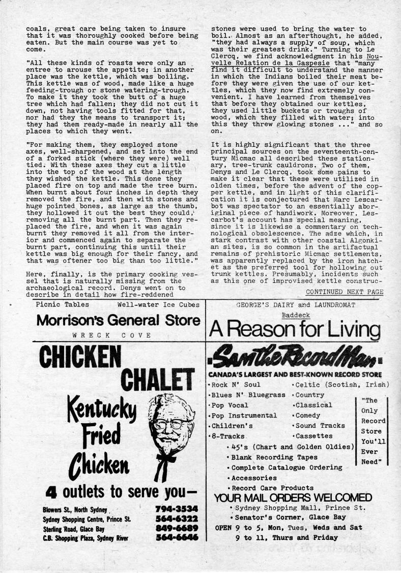 Published by Ronald Caplan on 1979/12/1 (272 reads)coals, great care being taken to insure that it was thoroughly cooked before being eaten. But the main course was yet to come. "All these kinds of roasts were only an entree to arouse the appetite; in another place was the kettle, which was boiling. This kettle was of wood, made like a huge feeding-trough or stone watering-trough. To make it they took the butt of a huge tree which had fallen; they did not cut it down, not having tools fitted for that, nor had they the means to transport it; they had them ready-made in nearly all the places to which they went. "For making them, they employed stone axes, well-sharpened, and set into the end of a forked stick (where they were) well tied. With these axes they cut a little into the top of the wood at the length they wished the kettle. This done they placed fire on top and made the tree burn. When burnt about four inches in depth they removed the fire, and then with stones and huge pointed bones, as large as the thumb, they hollowed it out the best they could,' removing all the burnt part. Then they re? placed the fire, and when it was again burnt they removed it all from the inter? ior and commenced again to separate the burnt part, continuing this until their kettle was big enough for their fancy, and that was oftener too big than too little." Here, finally, is the primary cooking ves? sel that is naturally missing from the archaeological record. Denys went on to describe in detail how fire-reddened stones were used to bring the water to boil.v Almost as an afterthought, he added, "they had always a supply of soup, which was their greatest drink." Turning to Le Clercq, we find acknowledgment in his Nou? velle Relation de la Gaspesie that "many find it difficult to understand the manner in which the Indians boiled their meat be? fore they were given the use of our ket? tles, which they now find extremely con? venient. I have learned from themselves that before they obtained our kettles, they used little buckets or troughs of wood, which they filled with water; into this they threw glowing stones ..." and so on. It is highly significant that the three principal sources on the seventeenth-cen? tury Micmac all described these station? ary, tree-trunk cauldrons. Two of them, Denys and Le Clercq, took some pains to make it clear that these were utilized in olden times, before the advent of the cop? per kettle, and in light of this clarifi? cation it is conjectured that Marc Lescar? bot was spectator to an essentially abor? iginal piece of handiwork. Moreover, Les? carbot 's account has special meaning, since it is likewise a commentary on tech? nological obsolescence. The adze which, in stark contrast with other coastal Algonki? an sites, is so common in the artifactual remains of prehistoric Micmac settlements, was apparently replaced by the iron hatch? et as the preferred tool for hollowing out trunk kettles. Presumably, incidents such as this one of improvised kettle construc- CONTINUED NEXT PAGE Picnic Tables Well-water Ice Cubes Morrison's General Store WRECK COVE GEORGE'S DAIRY and LAUNDROMAT Baddeck A Reason for Living CHICKEN • ', rr CHALET K'ntudqi *'' fried 4 outlets to serve you- CANADA'S LARGEST AND BEST'NOWN RECORD STORf Rock N' Soul 'Blues N' Bluegrass Pop Vocal Pop Instrumental ??Children's '8-Tracks • Celtic (Scotish • Country • Classical • Comedy • Sound Tracks • Cassettes Blowers SL, Horth Sydney. Sydney Shopping Centre, Prince SL Sterling Road, Glace Bay CB. Shopping Plaza, Sydney River 194-3534 5M-6322 849-6689 564-6646 • 45's (Chart and Golden Oldies) • Blank Recording Tapes • Complete Catalogue Ordering • Accessories • Record Care Products VOUR MAIL ORDERS WELCOMED • Sydney Shopping Mall, Prince St. • Senator's Comer, Glace Bay OPEN 9 to 5. Mon, Tues, Weds and Sat 9 to 11, Thurs and Friday Irish) "The Only Record Store You'll Ever Need"