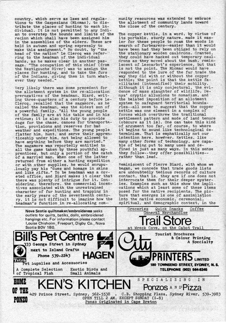 Published by Ronald Caplan on 1979/12/1 (318 reads)country, which serve as laws and regula? tions to the Gaspesians (Micmac), to dis? tribute the places of hunting to each in? dividual. It is not permitted to any Indi? an to overstep the bounds and limits of the region which shall have been assigned him in the assemblies of the elders. These are held in autumn and spring expressly to make this assignment." No doubt, by "the head of the nation" Le Clercq was refer? ring to the headman of the individual bands, as he makes clear in another pas? sage. "The occupation of this chief (from the Restigouche River) was to assign the places for hunting, and to take the furs of the Indians, giving them in turn what? ever they needed." Very likely there was some precedent for the allotment system in the re-allocation prerogatives of the headman.. Biard, writ? ing three-quarters of a century before Le- Clercq, recalled that the sagamore, as he called the headman, was the eldest son of a powerful family. "All the young people of the family are at his table and in his retinue; it is also his duty to provide dogs for the chase, canoes for transporta? tion, provisions and reserves for bad weather and expeditions. The young people flatter him, hunt, and serve their appren? ticeship under him, not being allowed to have anything before they are married." The sagamore was reportedly entitled to all the game taken by these youthful ap? prentices, but only a portion of the catch of a married man. When one of the latter returned from either a hunting expedition or with other supplies, he would scrupu- -lously pay his "dues and homage in skins and like gifts." To be headman was a cov? eted office, and Biard makes it clear that there was plenty of intrigue for it. Con? sidering, therefore, the commercial incen? tives associated with the unrestrained character of fur hunting and trapping in the early years of the seventeenth centu? ry, it is not difficult to imagine how the headman's function in re-allocating com? munity resources was extended to embrace the allotment of community lands toward the close of the century. The copper kettle, in a word, by virtue of its portable, sturdy nature, made it eas? ier for these people to roam the woods in search of furbearers--easier than it would have been had they been obliged to rely on the stationary wooden cauldrons. Granted, they could have hacked out temporary caul? drons as they moved about the bush, remin? iscent of Lescarbot's experience, but that is not the point. The Micmac would have responded to the lure of the fur trade the way they did with or without the copper kettle; the point is that the kettle fa? cilitated (intensified) their mobility. Although it is only conjectural, the evi? dence of mass slaughter of v/ildlife, De? nys' cryptic allusions to nomadism, and the belated imposition of an allotment system to safeguard territorial bounda- ries--all seem to suggest that the copper kettle was one element in a complex of forces which overthrew the traditional settlement pattern and mode of land tenure (obscure as it is). One can take this kind of argument too far, of course, to where it begins to sound like technological de? terminism. That is emphatically not our intention here, howdver. Kettles, like many other forms of technology, are capa? ble of being put to many uses and de? fined in just as many ways. In this sertse they follow--they offer possibilities • rather than lead. Reminiscent of Pierre Biard, with whom we began, we concede that trade goods lists are undoubtedly tedious records of culture contact, that is, they are if one does not interrogate them for their deeper myster? ies. Examples such as this show the impli? cations which at least some of these items posed for the native recipients. The pic? ture that emerges is one of assimilation into the native economic, ceremonial., spiritual, and demographic context, in the Nova Scotia quiltmaker/embroideress seeks outlets for quilts, batiks, dolls, embroidered hangings etc. For information please contact Louise Chisholm, Freeport, Digby Co., Nova Scotia BOV IBO. Bill's Pet Centre i??J ' '33 George Str'eet in Sydney ''''B liVi Jf'e'ct to Island Crafts " T iSA Phone 539-2243 HAGEN j pet Supplies and Accessories A Complete Selection Exotic Birds and 1 of Tropical Fish Small Animals Groceries Quick Snacks Coffee General Merchandise Trail Store at Wreck Cove, on the Cabot Trail /' "' _ Tourist Brochures / / JL 1 & Colour Printing 'H'F'ISO TOWNSEND STl'EET, SYDNEY, N.S. TELEPHONE (902) 564?M6 OF TBE PONZO iXtllN O rl I UntlN Ponzos A N D Pizza 429 Prince Street, Sydney, 562-5538 C.B. Shopping Plaza, Sydney River, 539-3983 OPEN TILL 2 AM, EXCEPT SUNDAY (1-8) Ponzo Originated in Cape Breton